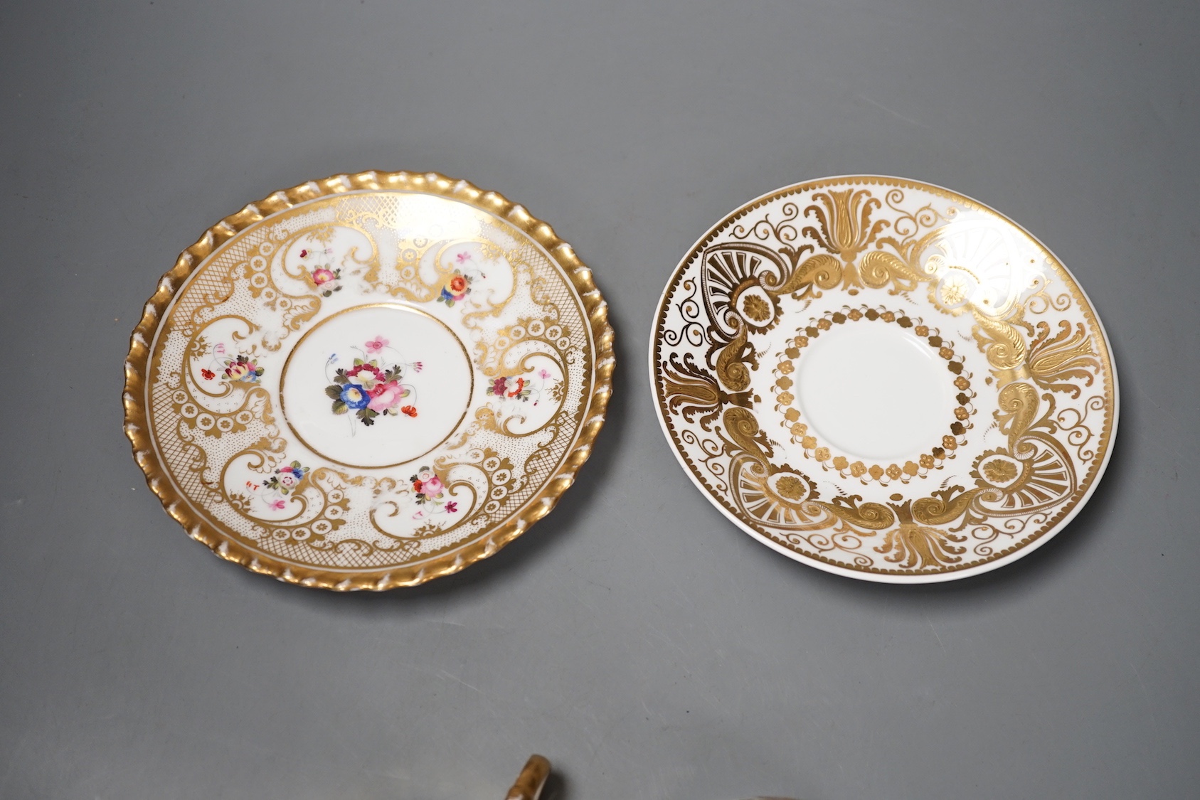 Lot 1362 , A Chamberlains Worcester gadroon bordered coffee cup and saucer painted with flowers, printed mark in puce and a Spode teacup and saucer with raised gilding in neo-classical style pattern 4327, mark and pattern in red