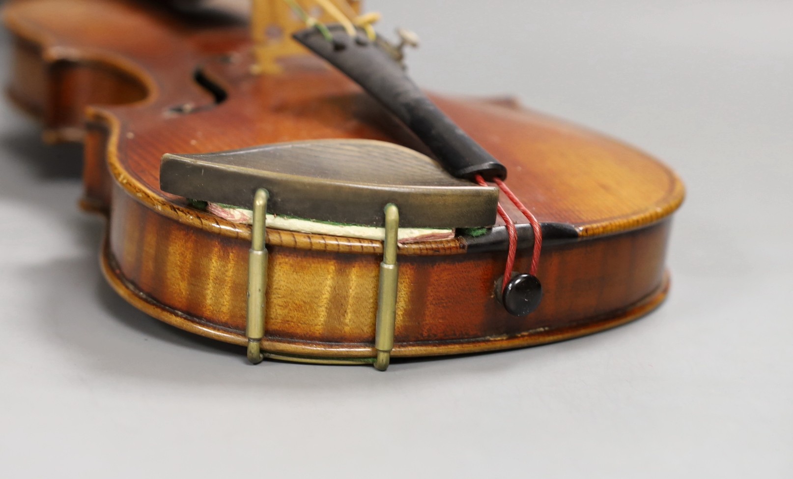 A quarter size late 19th century violin with bow, in E. Hill & Sons case, back measures 29cm