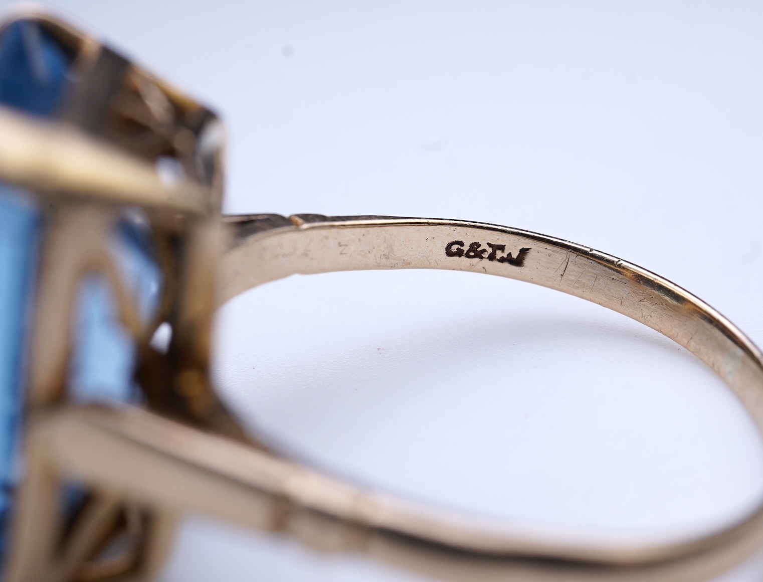 A synthetic blue spinel ring, claw-set with a step-cut synthetic blue spinel, mounted in 9ct gold, size T1/2, British hallmarks, gross weight approximately 8 grams