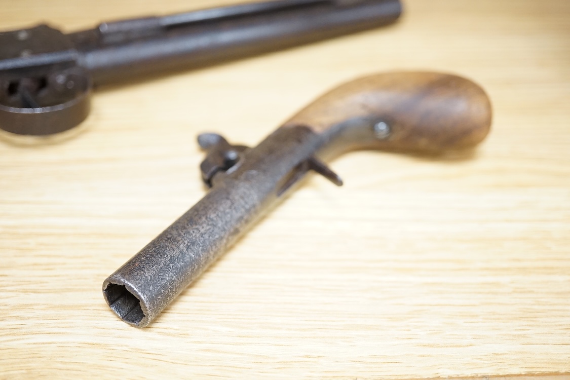 Lot 274 , A boxlock percussion pocket pistol with Damascus twist turn off barrel, liege proofs, rounded wooden grip replaced, together with an ‘over and under’ boxlock percussion pistol