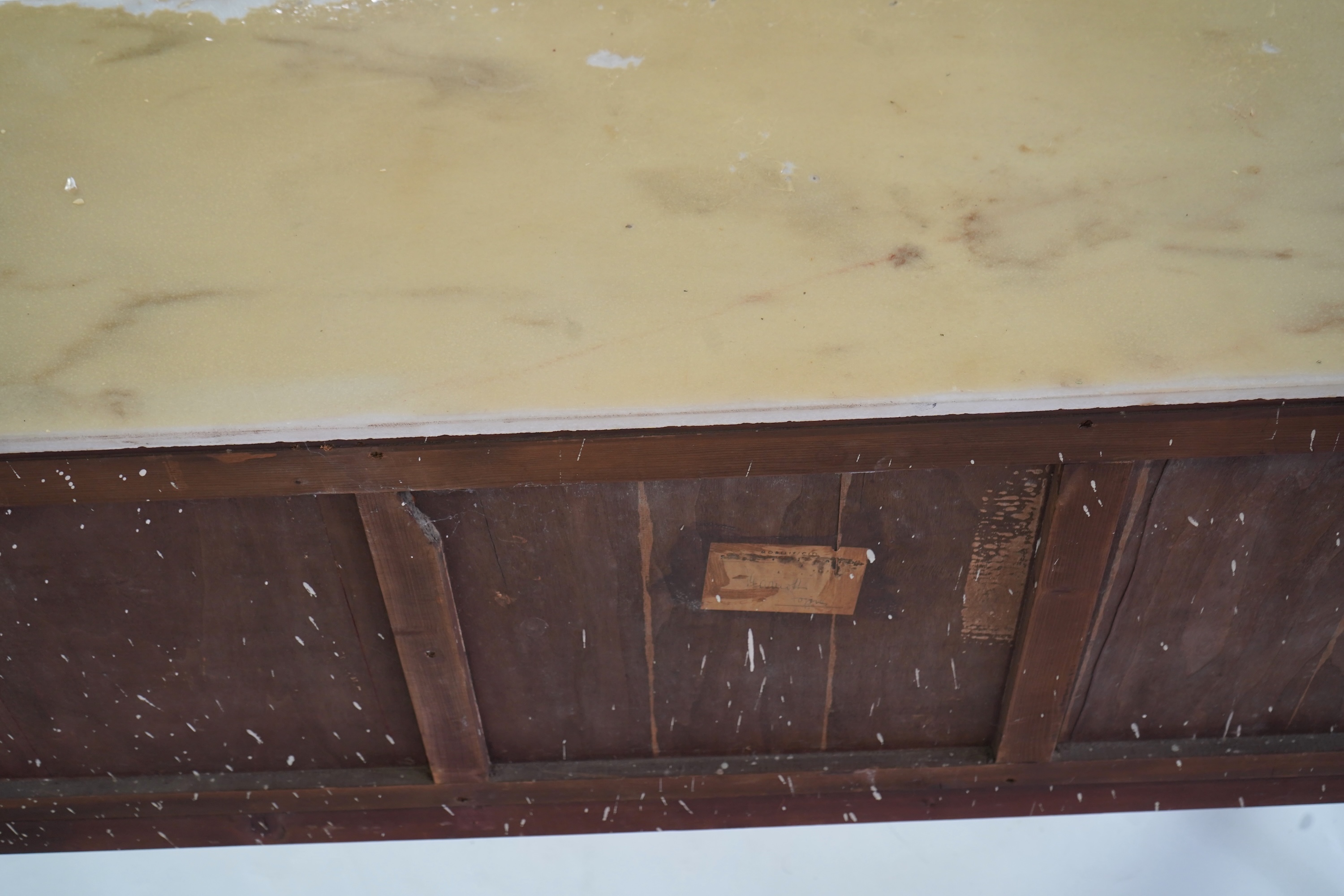Osvaldo Borsani (Italian, 1911-1985) for Atelier Borsani Varedo: A large Indian rosewood and mahogany credenza, 276.5cm wide x 49cm deep x 94cm high designed in 1948, the rectangular top with inset marble panel, the bombe front with central fluted fall-front cupboard, flanked by twin fall-front cupboards, raised on four splayed legs, 276.5cm wide x 49cm deep x 94cm high