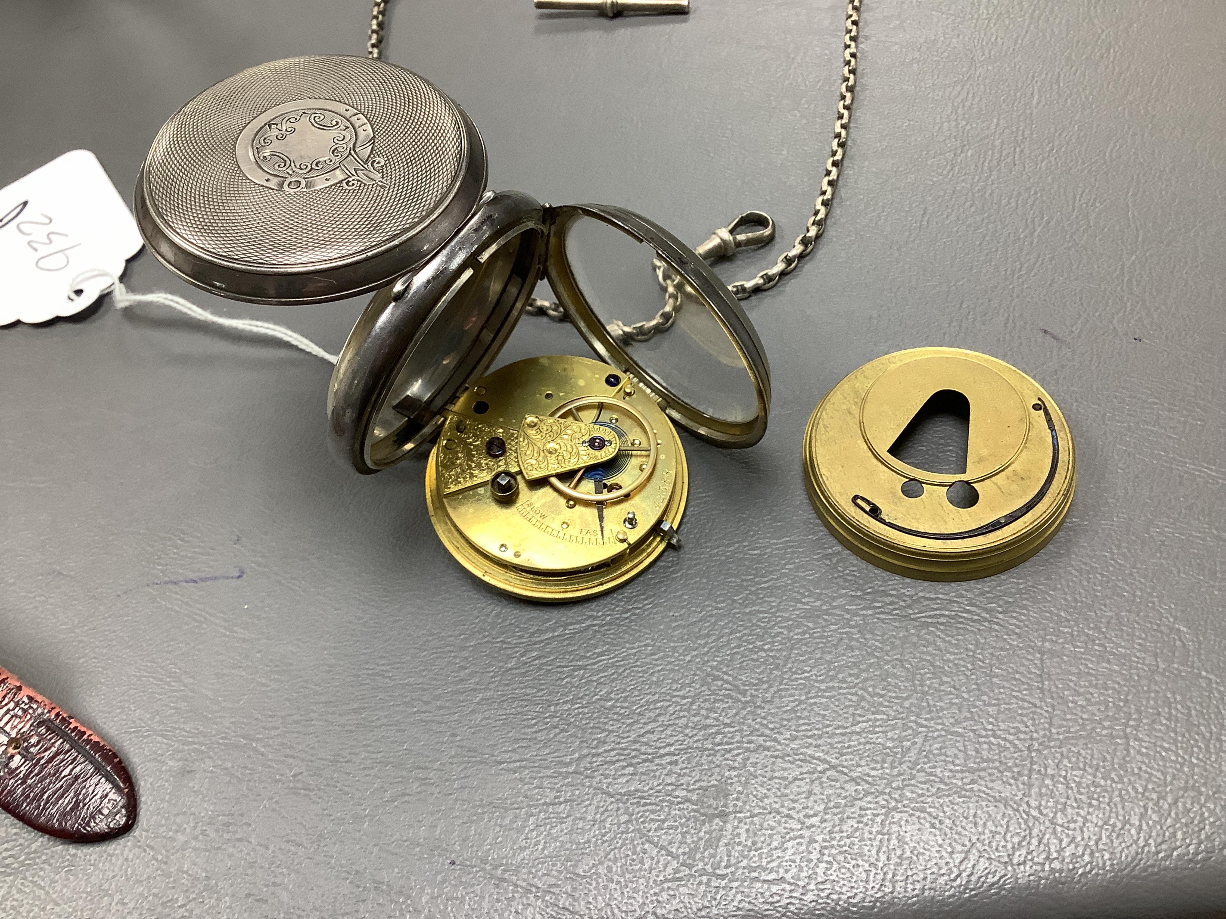 A late Victorian silver open faced keywind pocket watch, together with a Waltham gold plated pocket watch and six other items.