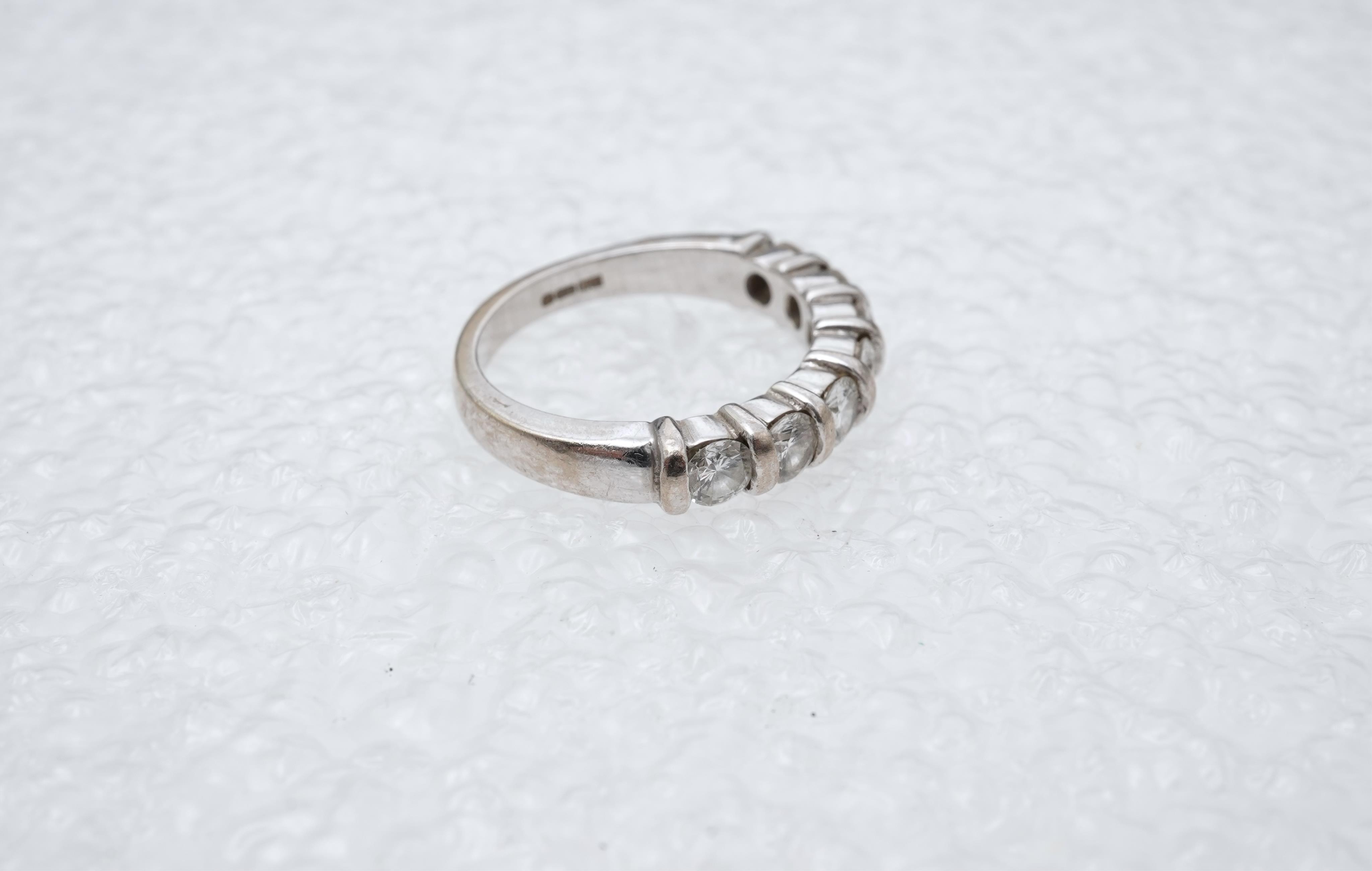 A seven-stone diamond ring, tension-set with seven brilliant-cut diamonds totalling approximately 0.80 carats, mounted in 18ct white gold, size J1/2, British hallmarks, gross weight approximately 4.5 grams
