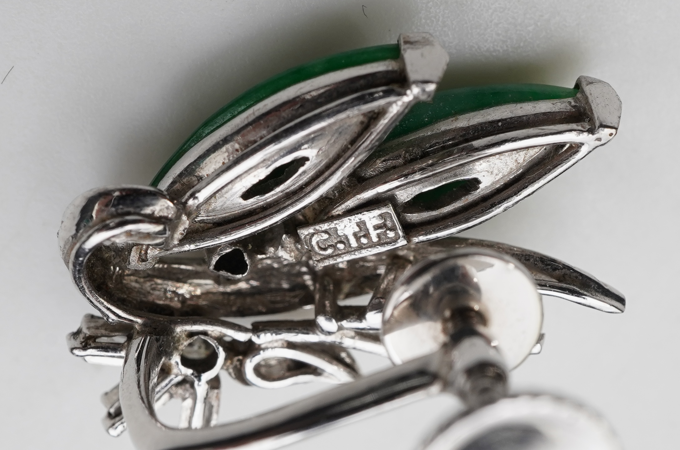 Chow Tai Fook, a jadeite and diamond demi-parure, 1960s, comprising: a brooch and pair of earrings, each of foliate spray design with polished details, set with marquise-shaped cabochon jadeite and brilliant-cut and baguette diamonds, mounted in white gold, brooch length 5.7cm, earrings 2.2cm each, screw fittings, stamped CTF and 18K, combined gross weight 14 grams