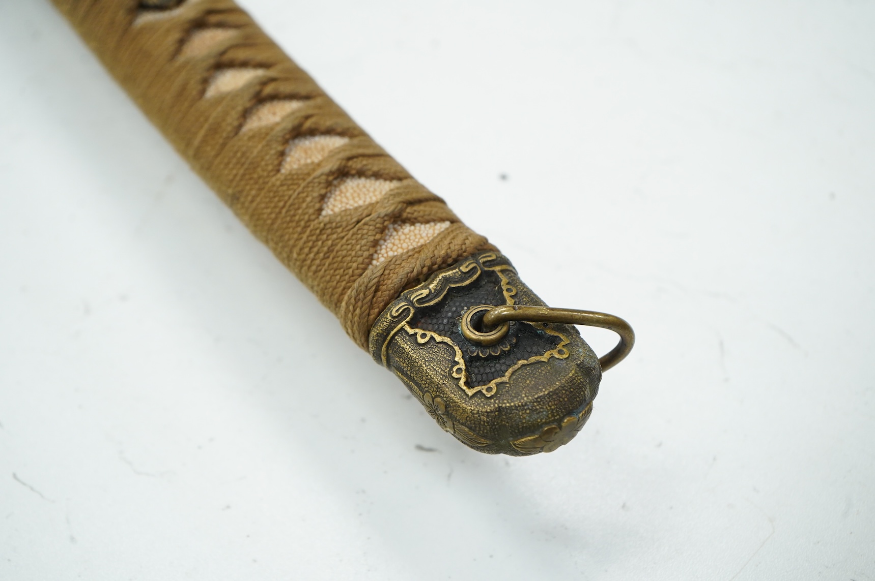 Lot 1264 , A Japanese World War II NCO’s sword katana with regulation blade and hilt with tape bound fish skin covered grip, and brass mounts, in its steel scabbard