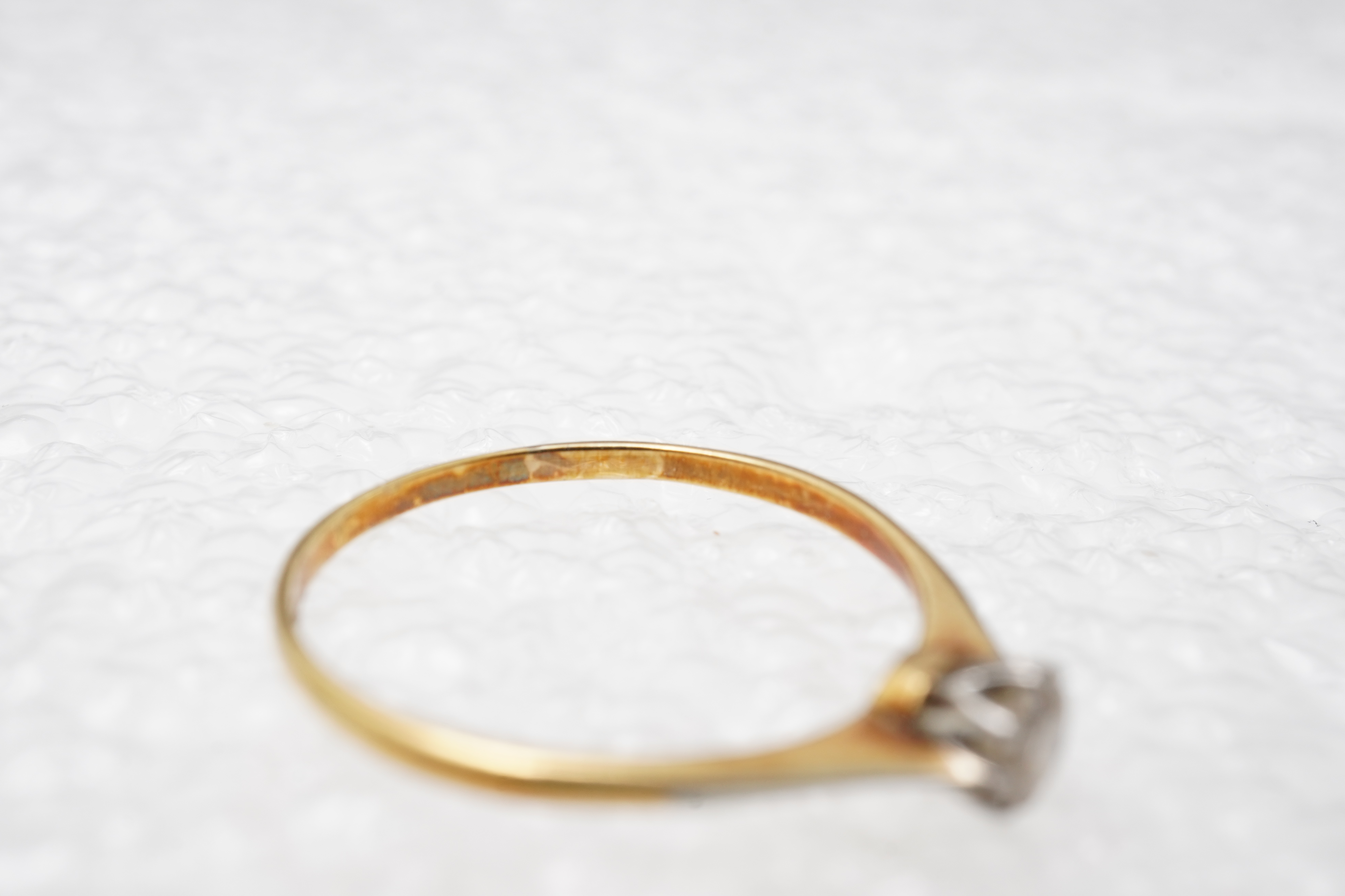 A small solitaire diamond ring, early 20th century claw-set with a circular-cut diamond weighing approximately 0.15 carats, mounted in gold, size O