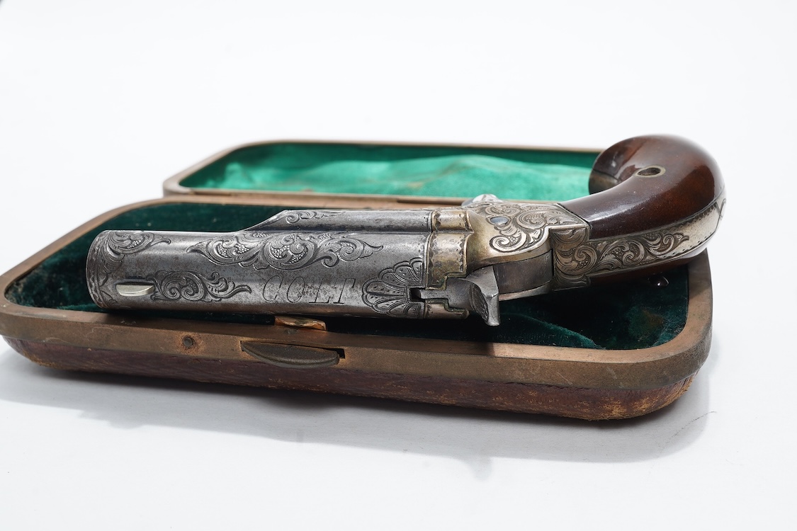 A cased 0.41 of an inch Colt single shot Deringer type rimfire pistol with foliate engraved frame and barrel, London proof marks two-piece polished walnut grips, in its contemporary ‘cigar case’ housing with green velvet lining