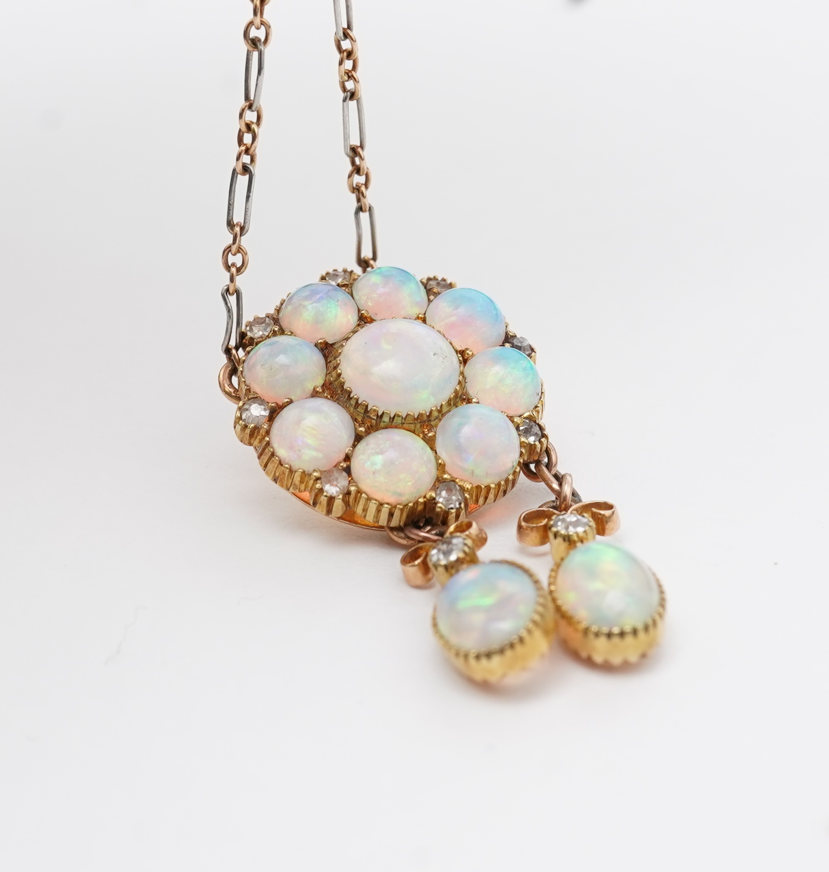 An attractive Edwardian opal and diamond demi-parure, early 20th century, comprising: a pendant of negligée design, composed of a floral cluster of opals suspending two opal pendants of asymmetrical length, accented by circular-cut diamonds, to a bicoloured chain, mounted in gold and platinum, pendant length 3.1cm, chain length 39cm; and a pair of drop earrings of similar design, length 3.3cm each, screw fittings