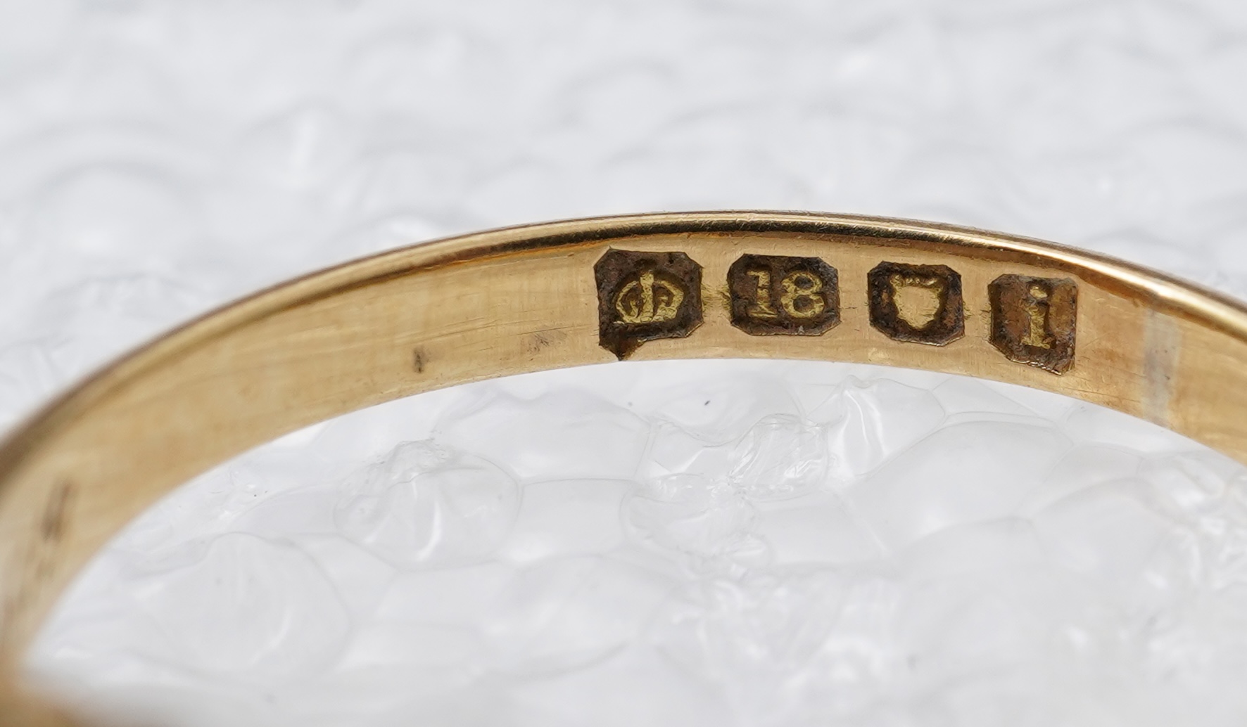 Lovely example, opals with good play of colour, width of ring at widest point 7.5mm.