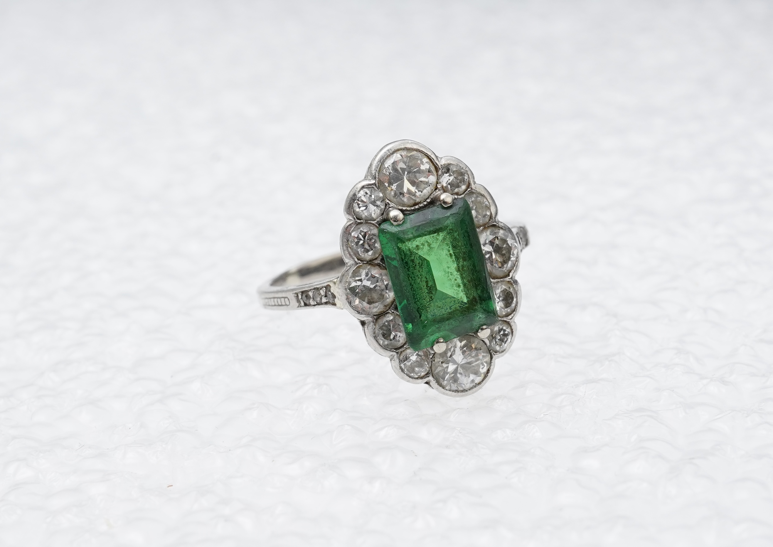 An Art Deco doublet stone and diamond ring, 1920s and later, designed as an oval cluster, set with a step-cut green doublet imitating emerald, to a border of circular-cut diamonds totalling approximately 0.90 carats, size L1/2