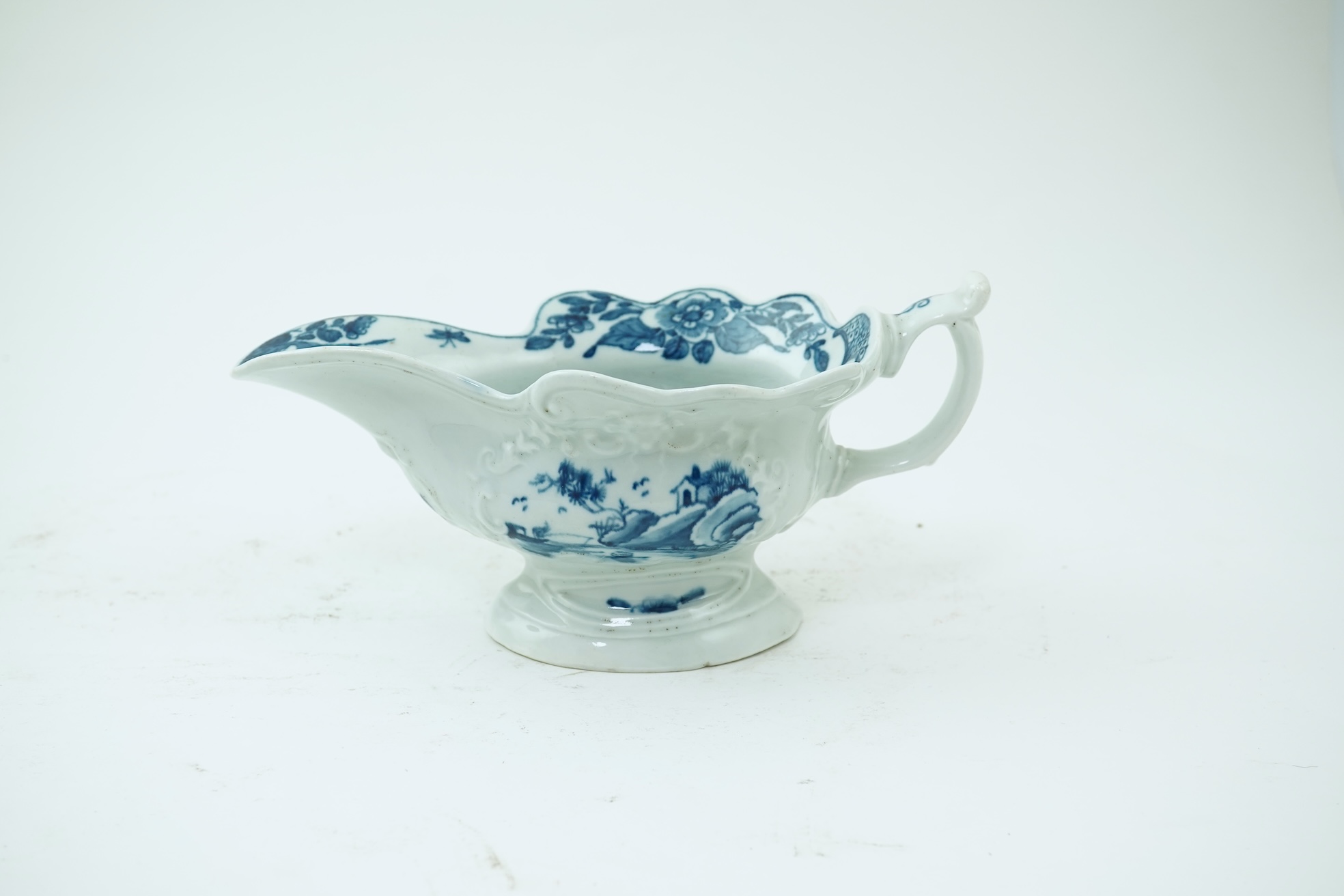 A Worcester blue and white Triangular Platform pattern high footed sauce boat c.1755