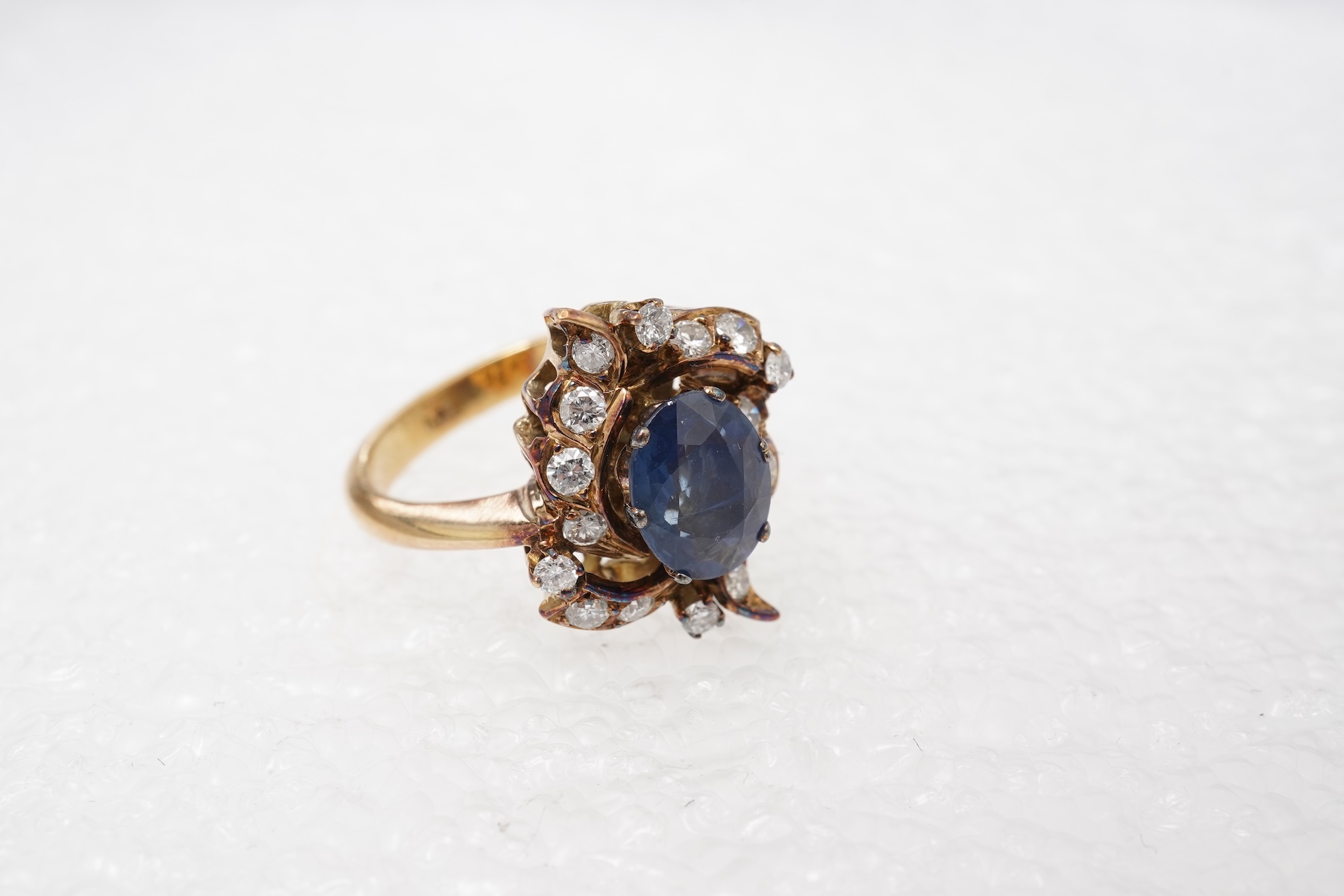 A sapphire and diamond cluster ring, claw-set with an oval sapphire weighing approximately 1.00 carat, within a foliate gold mount set with brilliant-cut diamonds totalling approximately 0.70 carats, mounted in gold, size P1/2