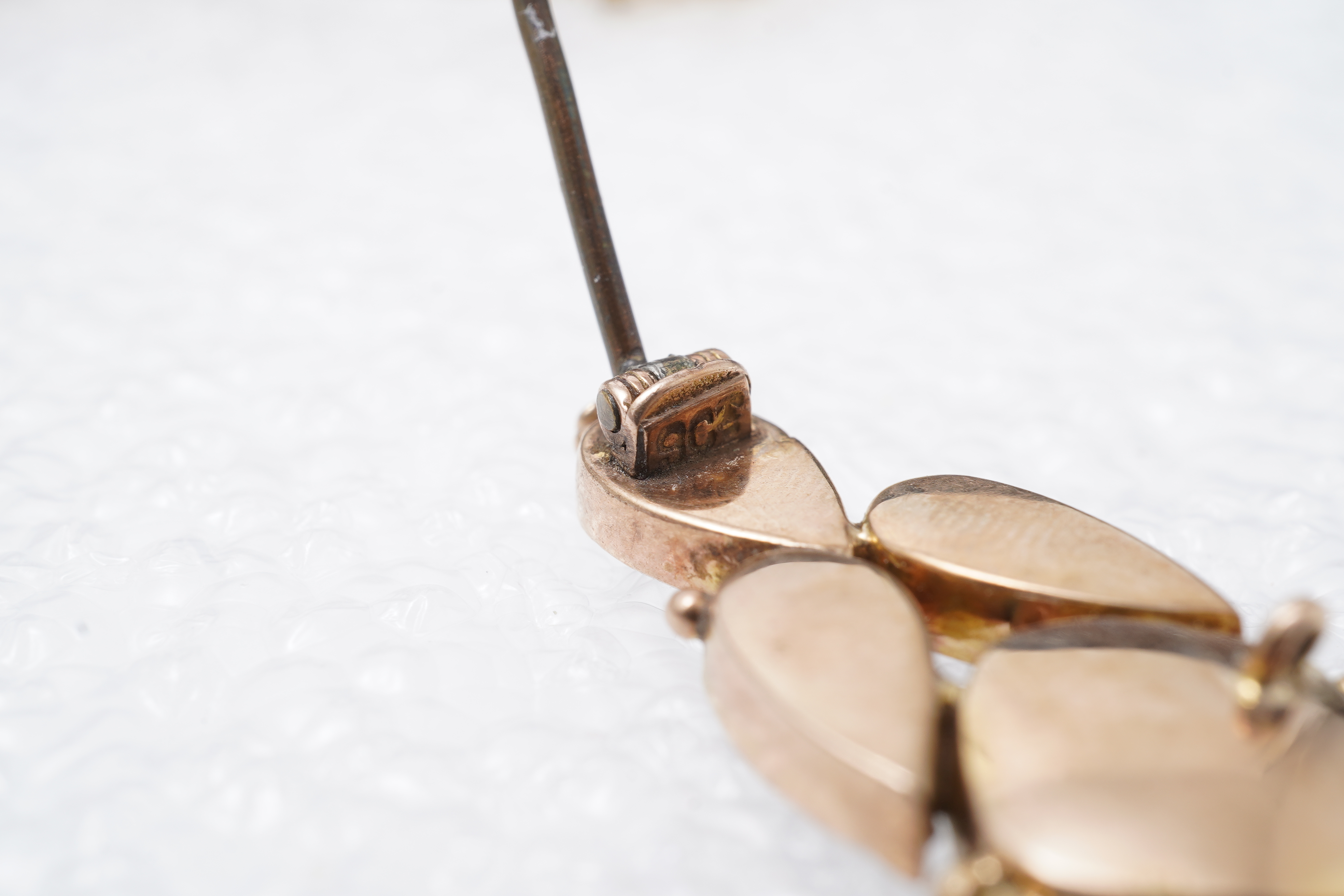 A group of garnet jewels, late 19th century and later, comprising: two bangles, each of hinged construction, set to the front with alternating sequences of cushion-shaped garnets and half pearls, larger inner circumference approximately 17.3cm, each mounted in gold, one with British hallmarks for 9ct gold, date latter for 1911, combined gross weight approximately 20 grams; a brooch composed of foil-backed pear- and cushion-shaped garnets, mounted in gold, length 4.3cm, gross weight approximately 4 grams; a brooch of knife wire construction, each end claw-set with a circular-cut garnet, mounted in gold, gross weight approximately 2.5 grams; and a ring set with an oval garnet, mounted in gold, size K1/2, stamped 9ct, gross weight approximately 1.4 grams