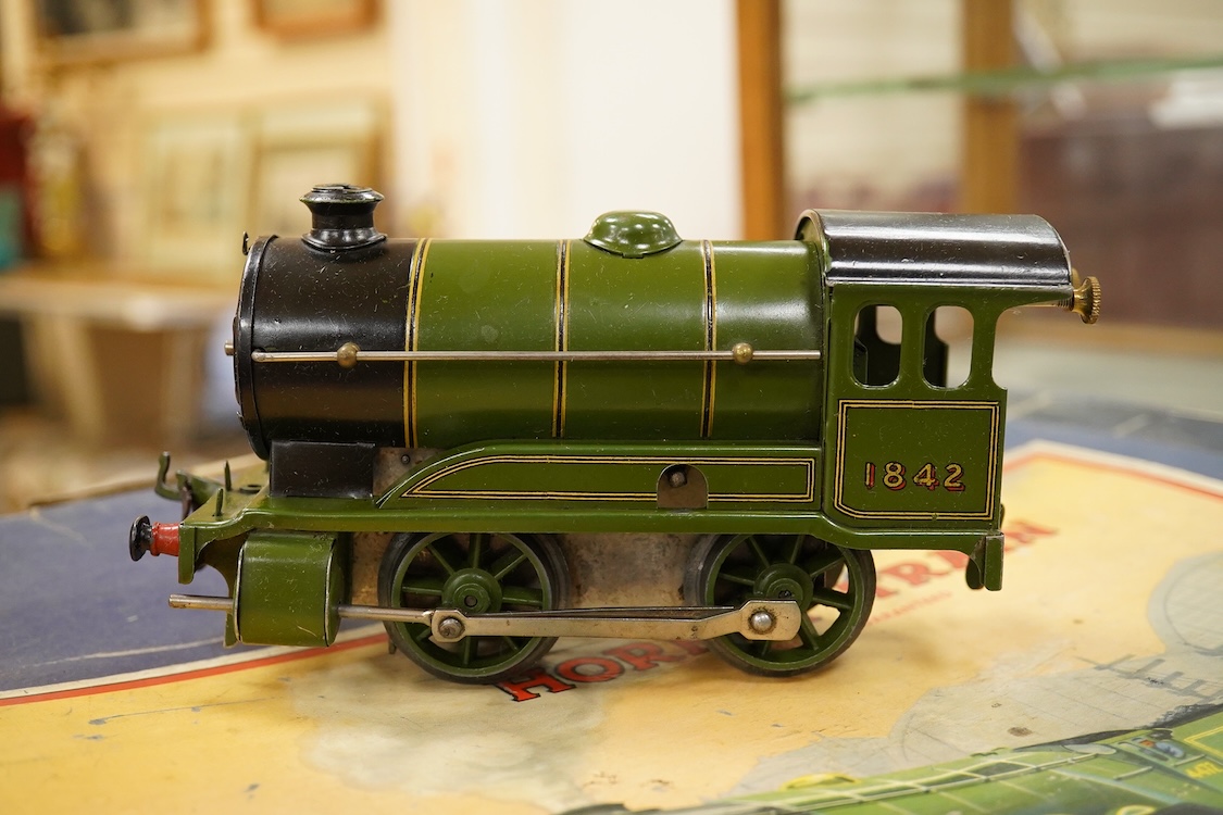 Lot 287 , Two Hornby 0 gauge tinplate clockwork train sets; a No.601 LMS Goods Set with 0-4-0 tender locomotive, 5600, in maroon livery, etc., together with a No.501 LNER passenger set with 0-4-0 tender locomotive, 1842, in green