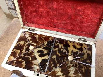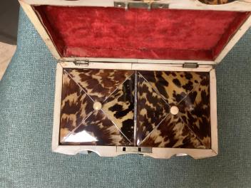 Lot 1379 , A mid 19th century decorative tortoiseshell and mother of pearl tea caddy, 20cm wide x 12.5cm high CITES Submission reference CXXC25Q1
