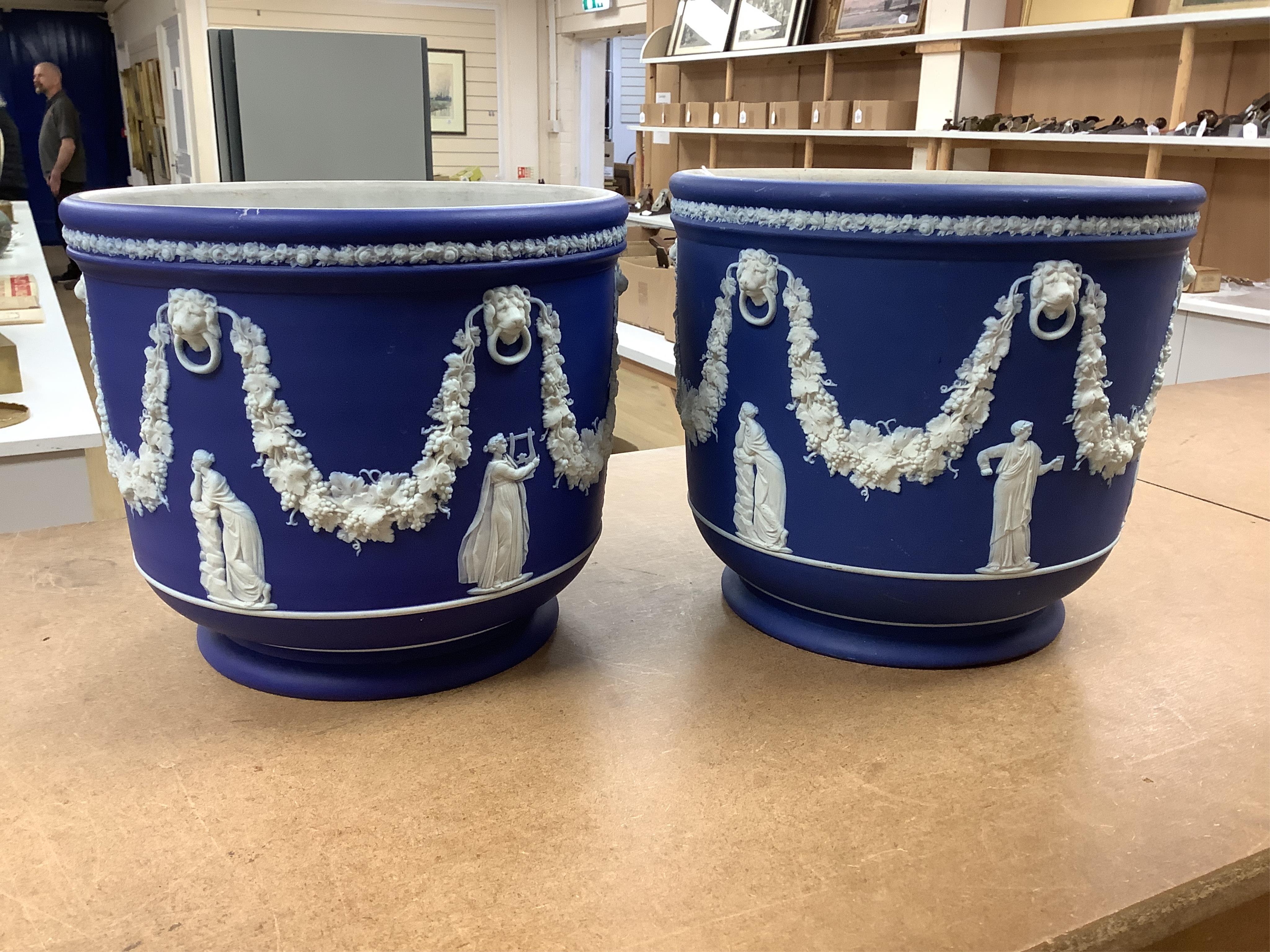A pair of Wedgwood blue Jasperware jardinieres, 23cm high