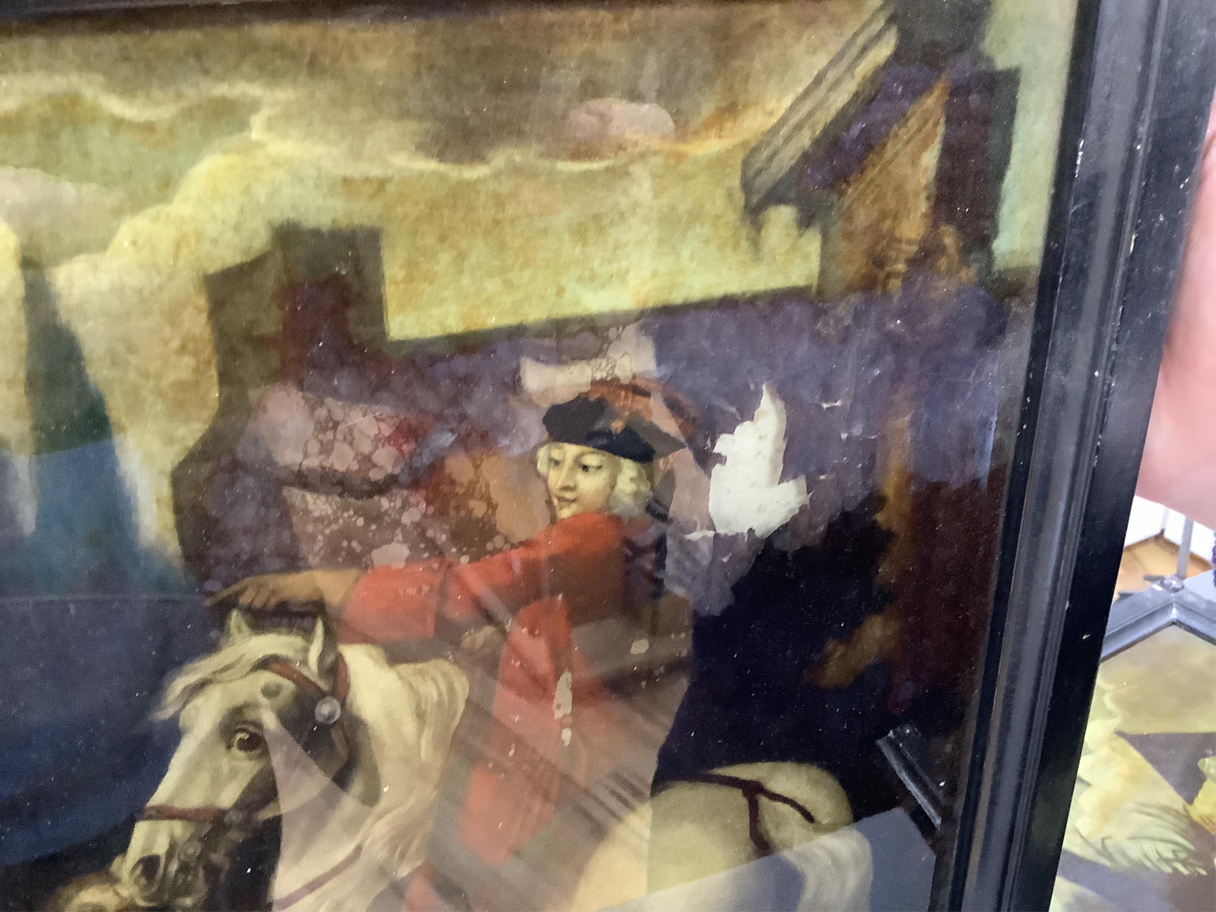 Five 19th century reverse glass painted prints to include after Amiconi, ‘See Europe Here!’, printed for and sold by B. Sayer, London, two damaged, framed, overall 41 x 30cm