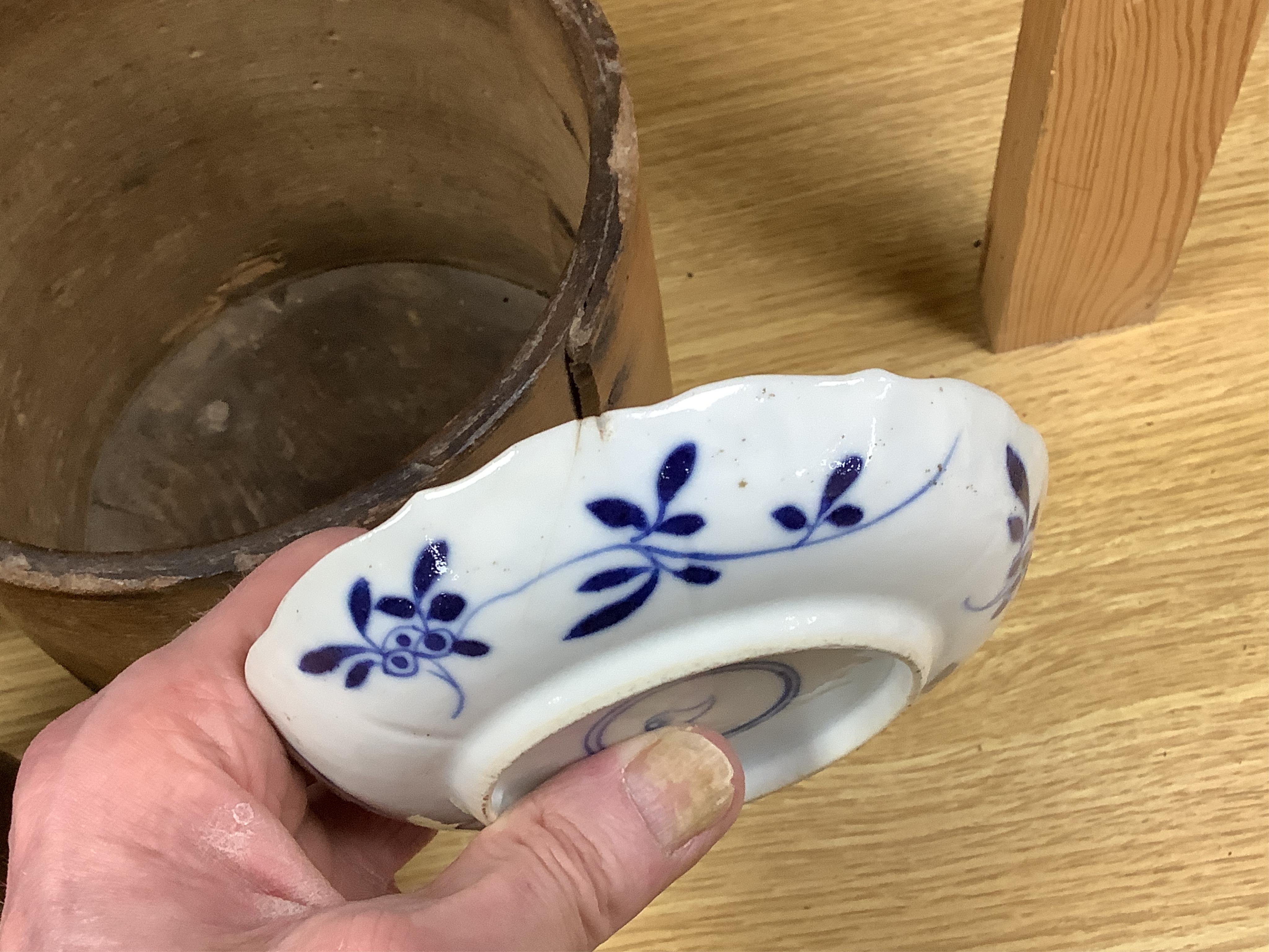 One teabowl crudely repaired; one teabowl with rimchips, image 6; tea caddy with shallow chip to shoulder and around neckrim; blue and gilt saucer with hairline cracks at centre; octagonal dish worn; rim chipped. Kangxi blue and white saucer small chip to rim. Others generally good.