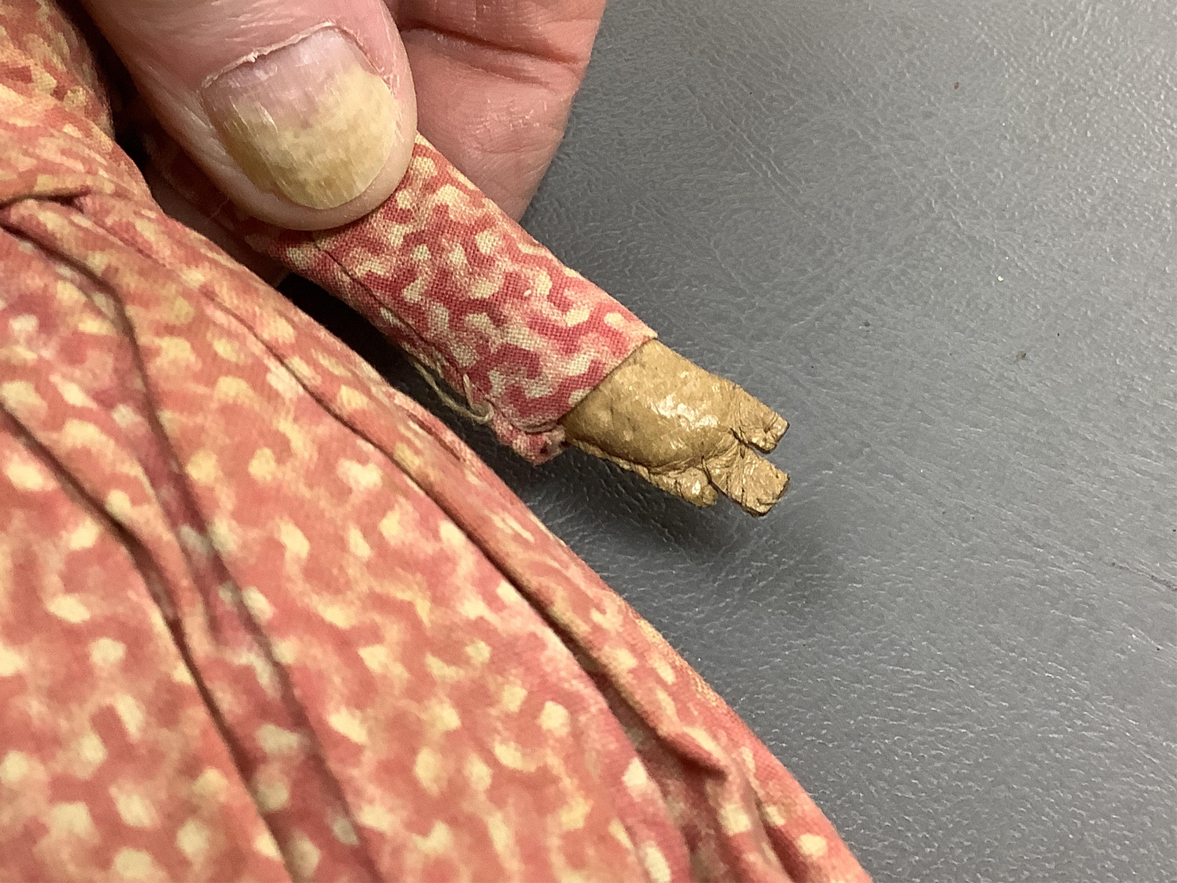 Face and forehead with several cracks; nose rubbed; wear to skull. Limbs in tact and fingers are kid-leather. Feet and shoes are cloth. Looks like real hair but is detached from head. Dress with small hole at centre of stomach; dress a little discoloured at the folds; stitching loose at her back. Condition of hat see final images.