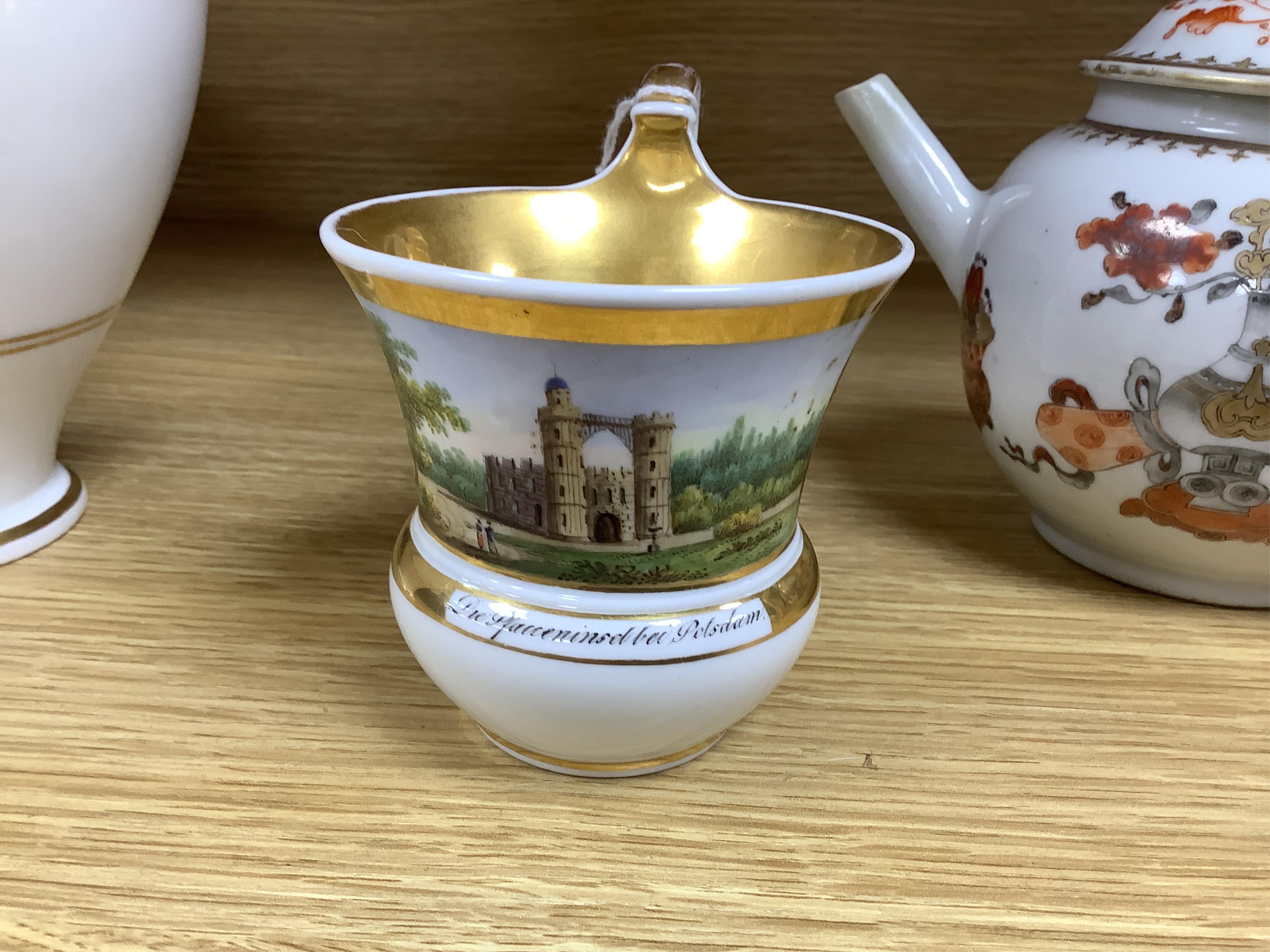 A 19th century KPM gilded cup and saucer, together with other cabinet examples and a pot and cover with Vienna mark, largest cup 11cm high