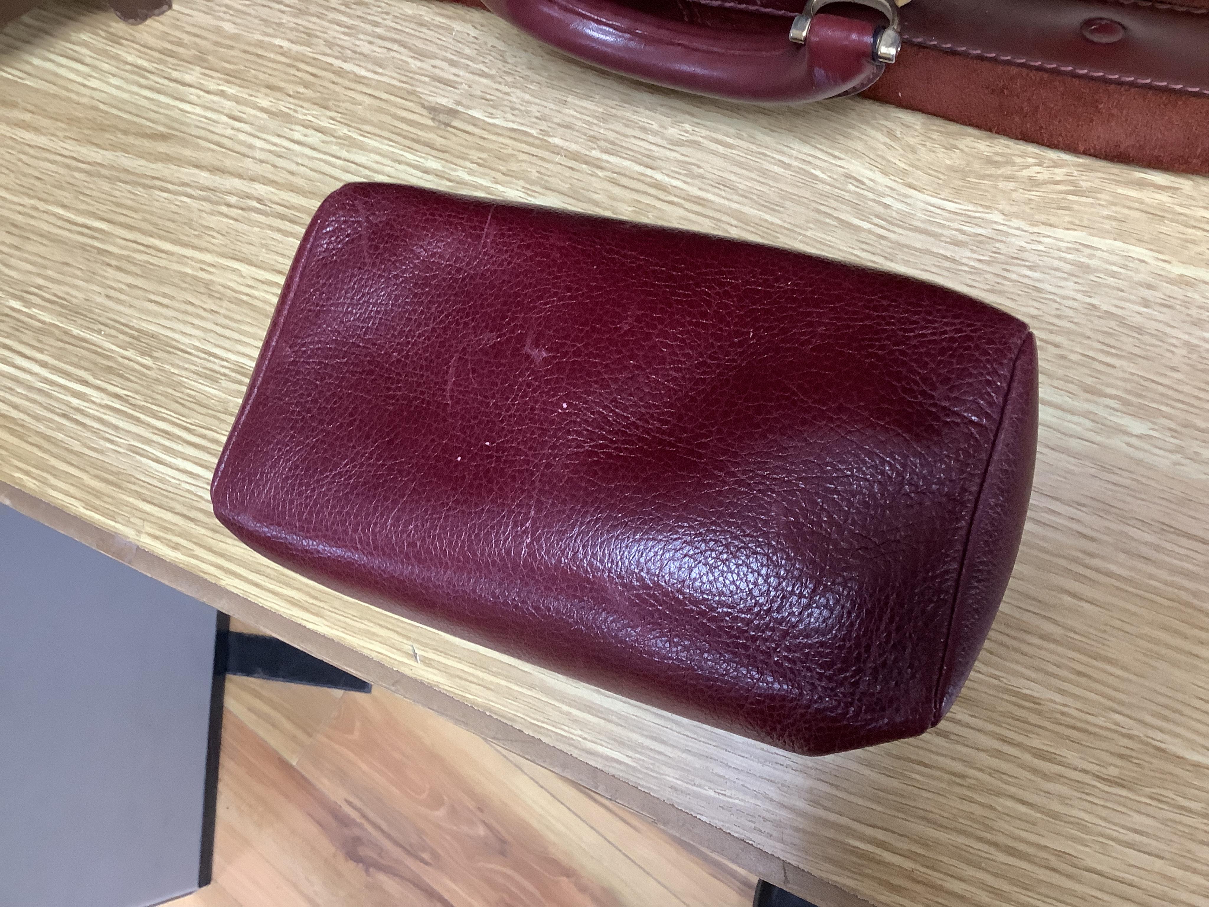 Must de Cartier bag general wear particularly rear side and fingernail marks around carrying handle; five keys in pouch; 44 x 34cm, depth 12cm. Wash bag with light wear; 21x11cm. Suspected for male use.