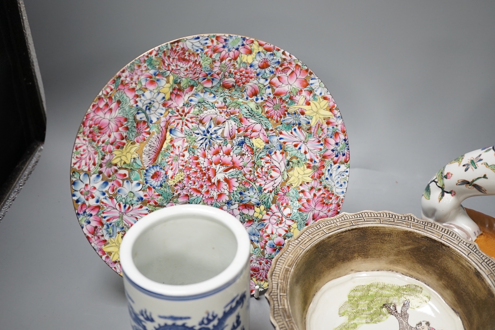 A Chinese porcelain bowl, brush pot, plate and a pair of dogs