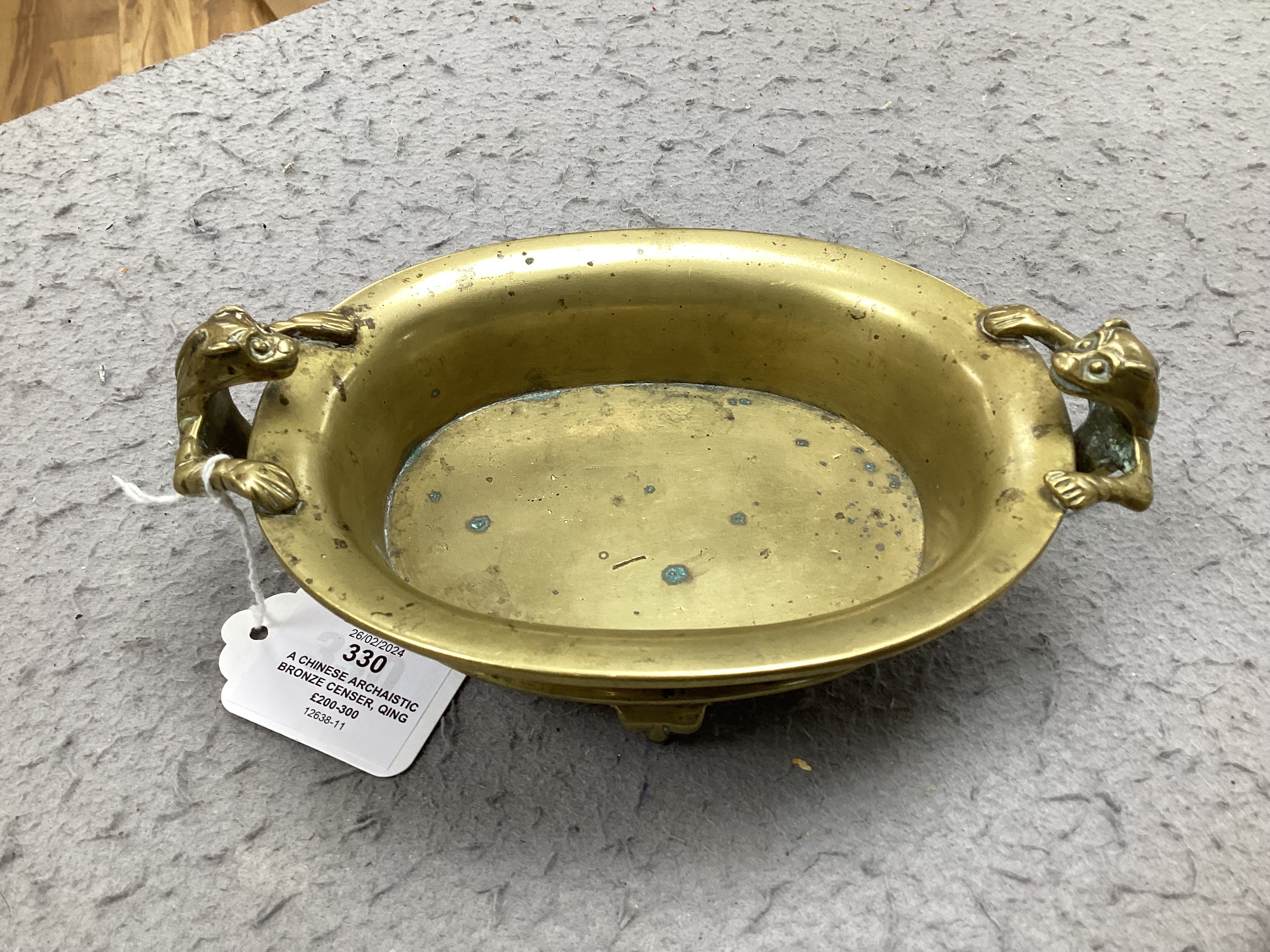 Lot 330 , A Chinese archaistic bronze censer, Qing dynasty, a mirror and various Asian bronzes etc, censer 19cm wide
