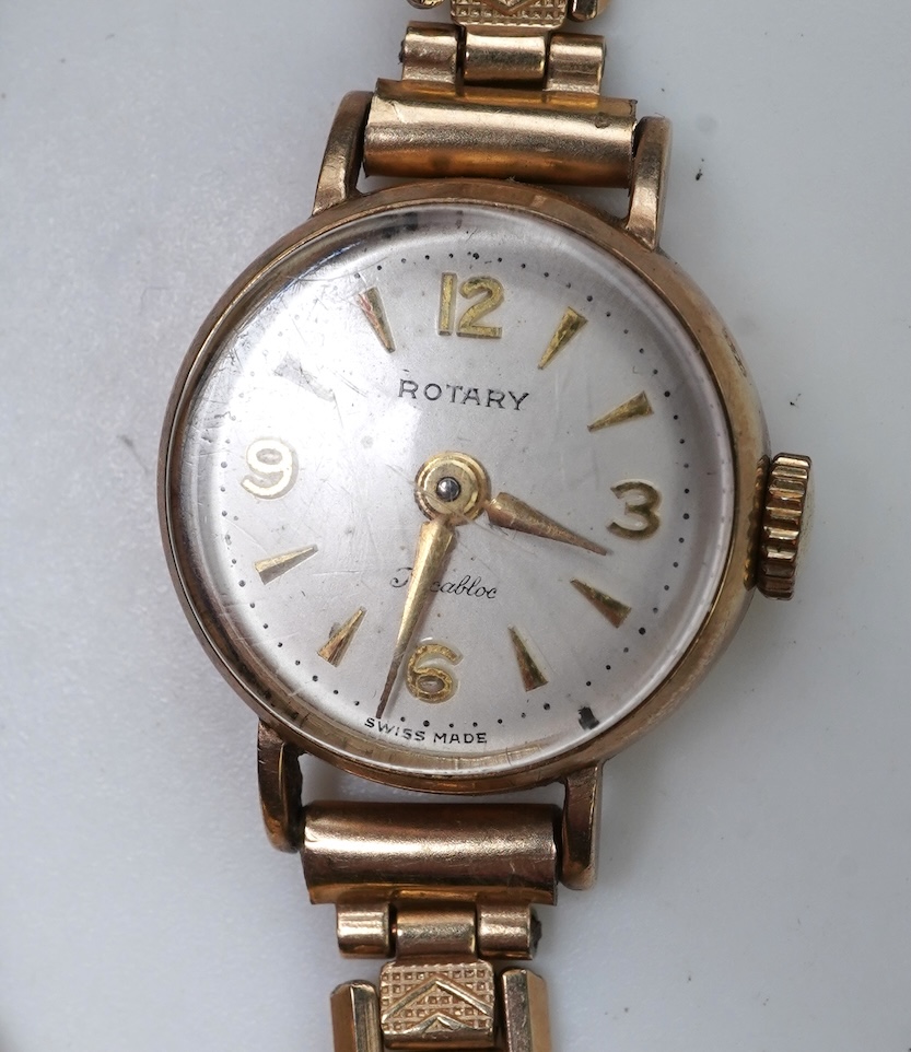 A collection of jewels and a gold wristwatch, comprising: an Edwardian bar brooch set with seed pearls and circular-cut sapphires, mounted in gold and platinum, length 5.7cm, base metal pin; a pair of gold earrings of abstract design, set with ruby cabochons, length 1.5cm, stamped 18ct, combined gross weight 2 grams; a lady's 9ct gold Rotary watch, British hallmarks, on a gilt metal strap; a gold bolt ring clasp, stamped 15CT, gross weight approximately 0.5 grams; and a cabochon glass pendant enclosing a seed, length 1.7cm including bail
