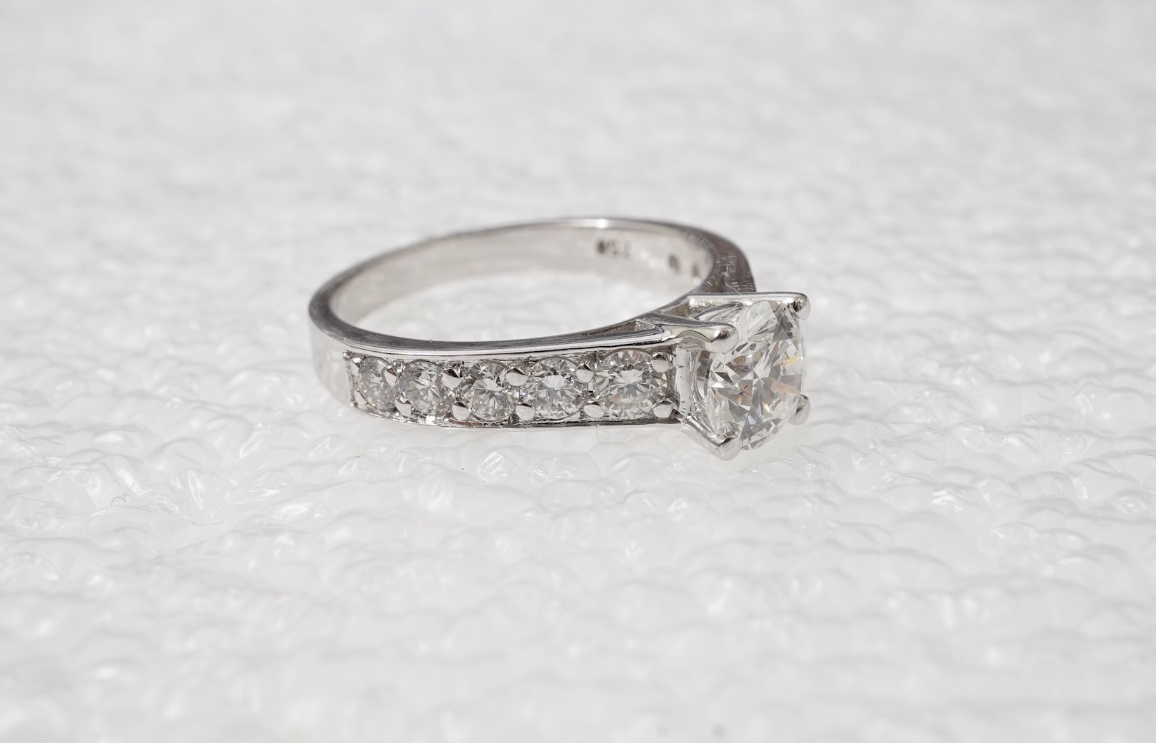 A diamond ring, claw-set with a brilliant-cut diamond weighing 1.00 carat, to shoulders set with brilliant-cut diamonds totalling approximately 0.80 carats, mounted in white gold, size O, stamped 750, gross weight 4.5 grams