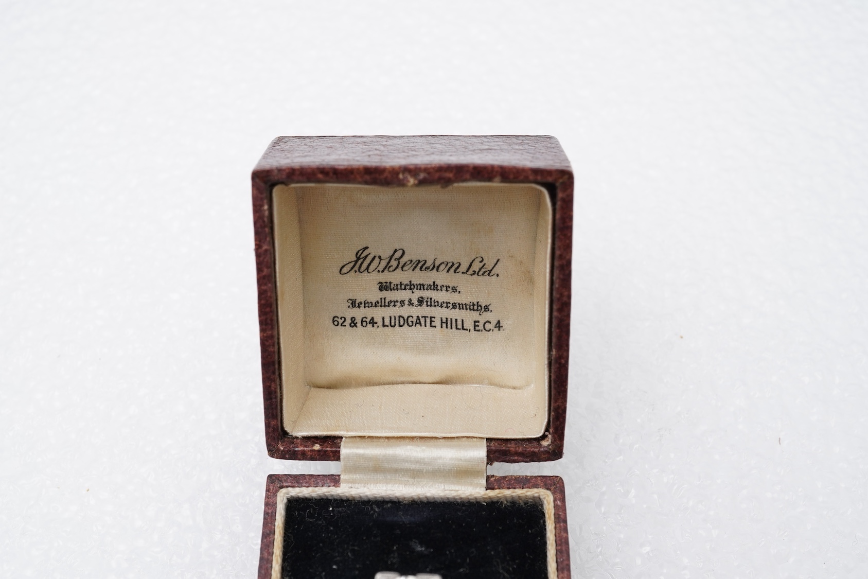 In good condition, central diamond estimated colour J/K, estimated clarity VS, med-strong blue fluorescence.