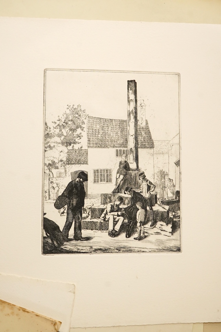 A folio of pencil sketches, gouaches, charcoals and etchings, to include portrait studies, an etching by Carl Wragg and one by Phylis E Gussen? and two ink illustrations, letters of the alphabet, unframed