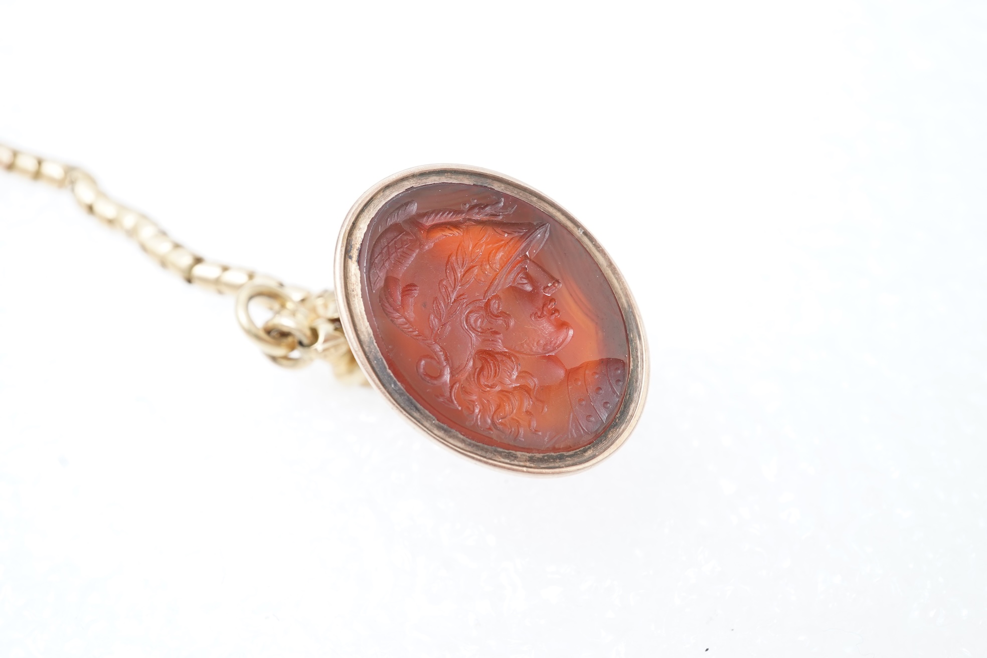 A chatelaine, 19th century composite, the gilt metal jump ring suspending four pendants from gold chains, including: a gold locket designed as a book, inscribed 'Edwin King Suzie Johnston married 11th July 1876', length 2.7cm including pendant bail; an oval locket with foliate engraving, initialled BSK, length 3.2cm; a telescopic pencil cased in gold; and a carnelian pendant depicting Achilles in profile, in gilt metal, total gross weight approximately 38 grams