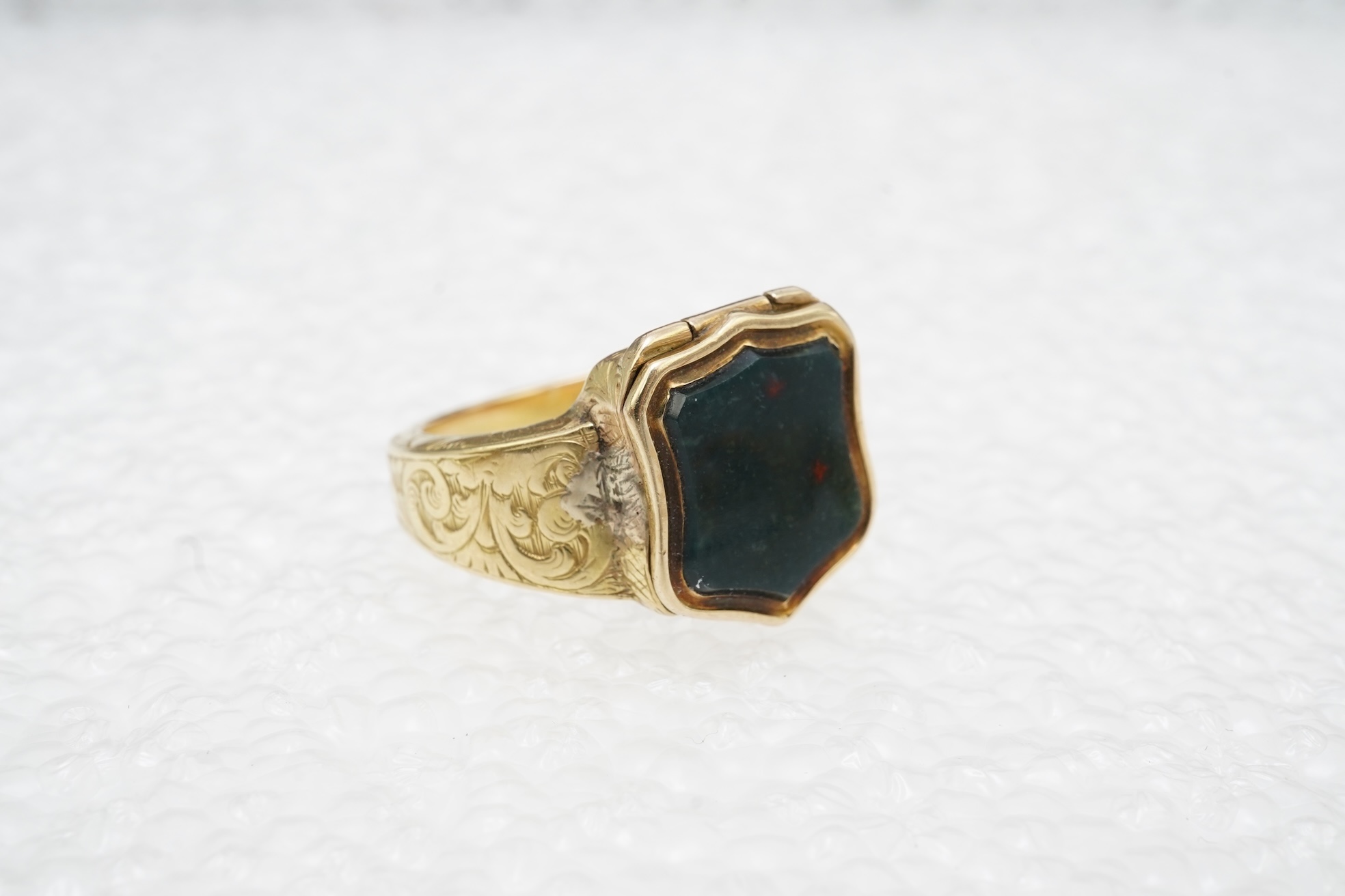 A collection of jewels, late 19th/early 20th century, comprising: a gold locket pendant designed as a Bible, with foliate scroll decoration, enclosing a hinged rectangular photograph compartment, length 2.8cm; a gold stick pin designed as a stag, length 6.3cm; a cultured pearl stickpin, length 6.2cm; a gold signet ring set with a shield-shaped bloodstone, opening to reveal a hidden compartment, to a band engraved with scrolled decoration, size M1/2; and a turquoise cross pendant on a gold chain, combined gross weight approximately 17 grams
