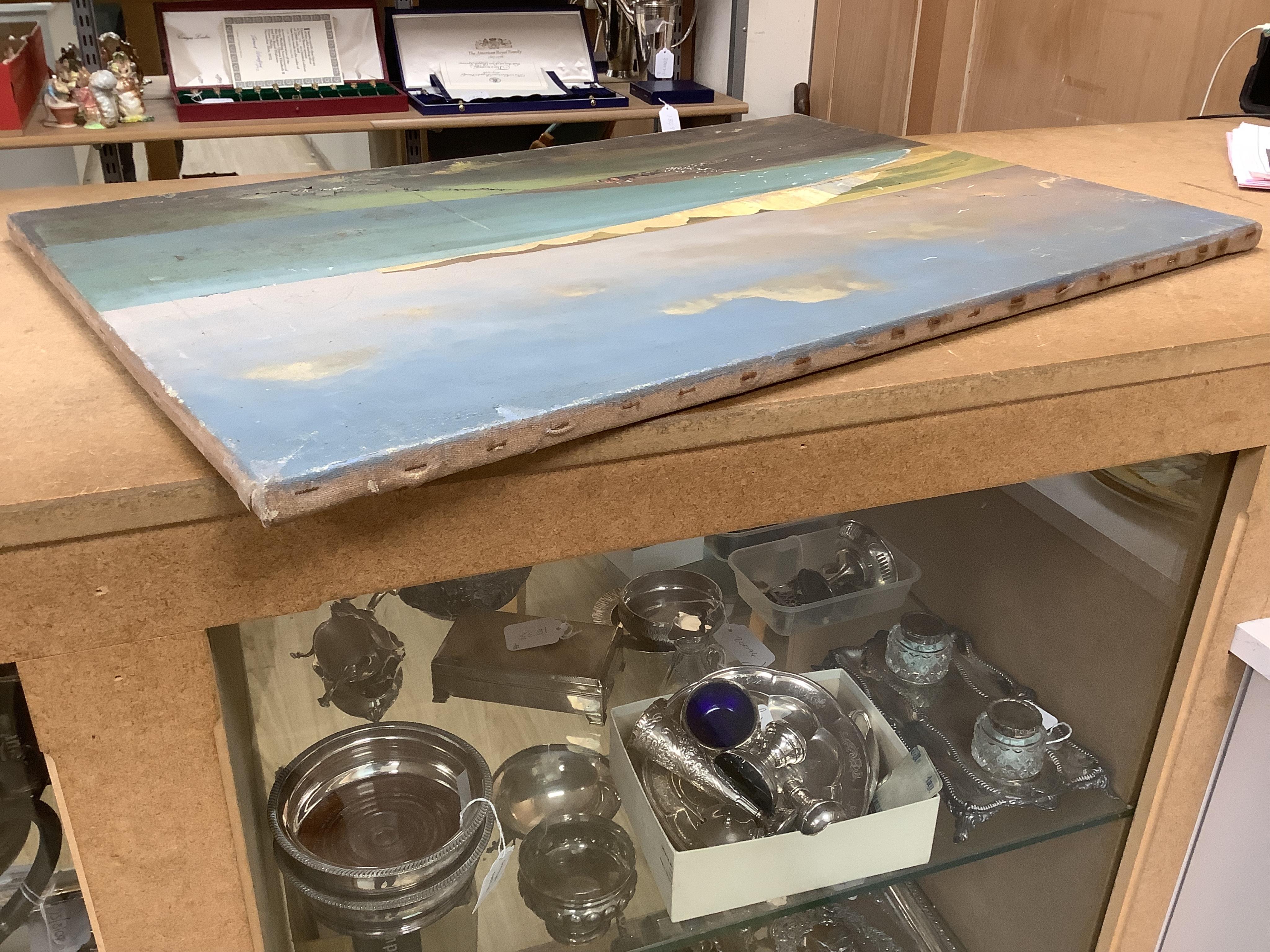 Canvas with diagonal tear and unsightly losses to oil paints in this torn area, all shown in image 5; several rubs to oils upper left, image 6; further flake to oil paint top-right, and coloured-in to disguise; flaked paint beneath signature, image 4. Reverse images show two inscriptions, images 8 to 10. Rusting staples, image 11.
