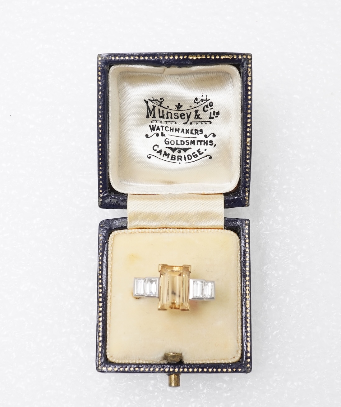 Cropp & Farr, a topaz and diamond cocktail ring, circa 1962, claw-set with a step-cut topaz weighing approximately 2.50 carats, to shoulders set with baguette diamonds totalling approximately 0.60 carats, mounted in 18ct gold and platinum, size L, British hallmarks, stamped PLAT, maker's mark C&F for Cropp and Farr, gross weight approximately 4.5 grams
