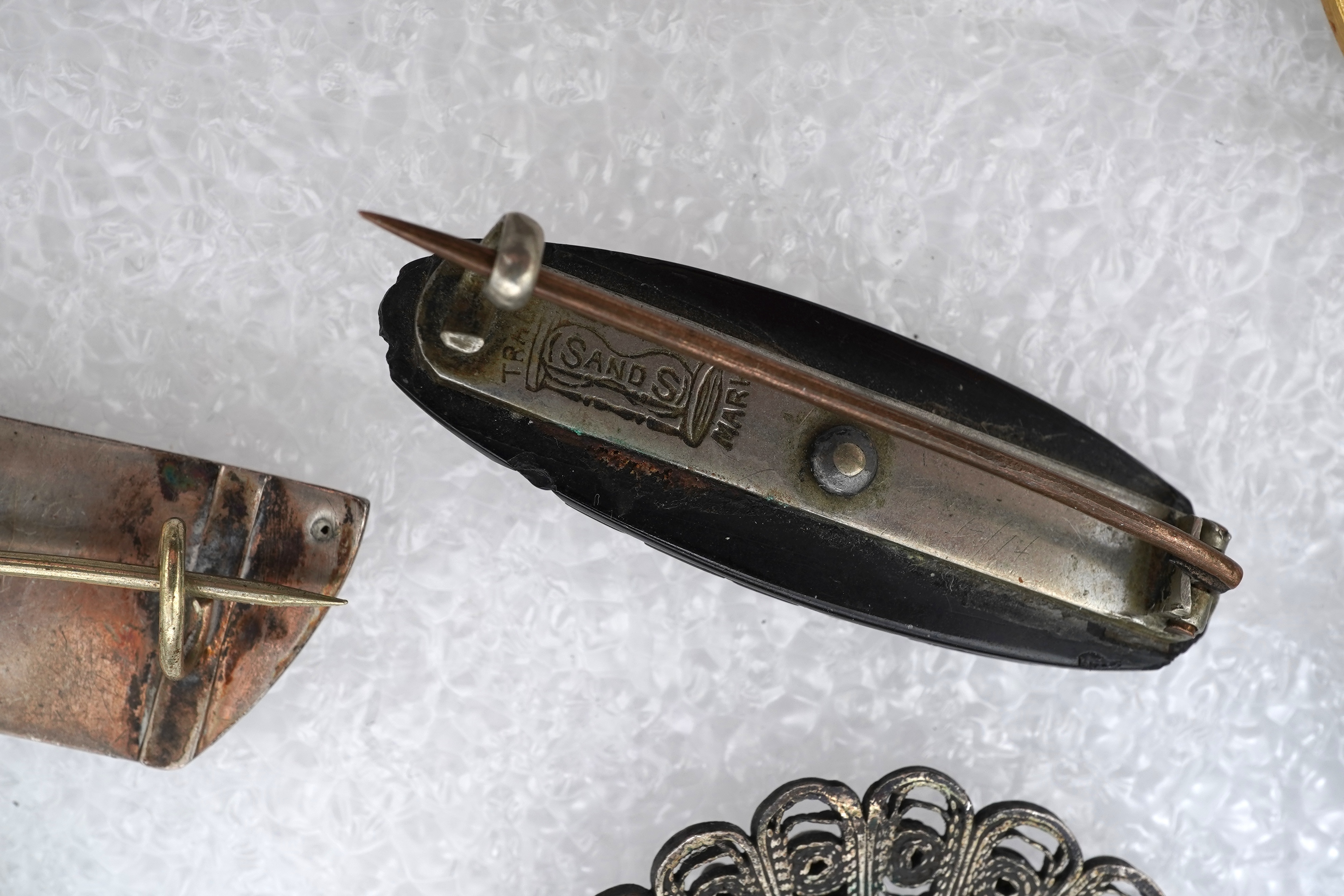 A collection of jewels, comprising: a metal collar necklace suspending a cross pendant; a black glass bead necklace; an amethyst, iolite, moonstone and mother of pearl pendant; a gilt metal pendant containing hairwork; a paste sunburst brooch; a banded onyx brooch; a gilt metal zodiac wheel brooch; a black enamel and seed pearl panel brooch; a drilled Spanish silver coin pendant dated 1738 on a silver chain; a pair of marcasite earrings; a heart-shaped scent bottle fob brooch; a filgree brooch with an Arabic inscription; and a black resin/moulded bog oak brooch centring on a gold and seed pearl trefoil motif