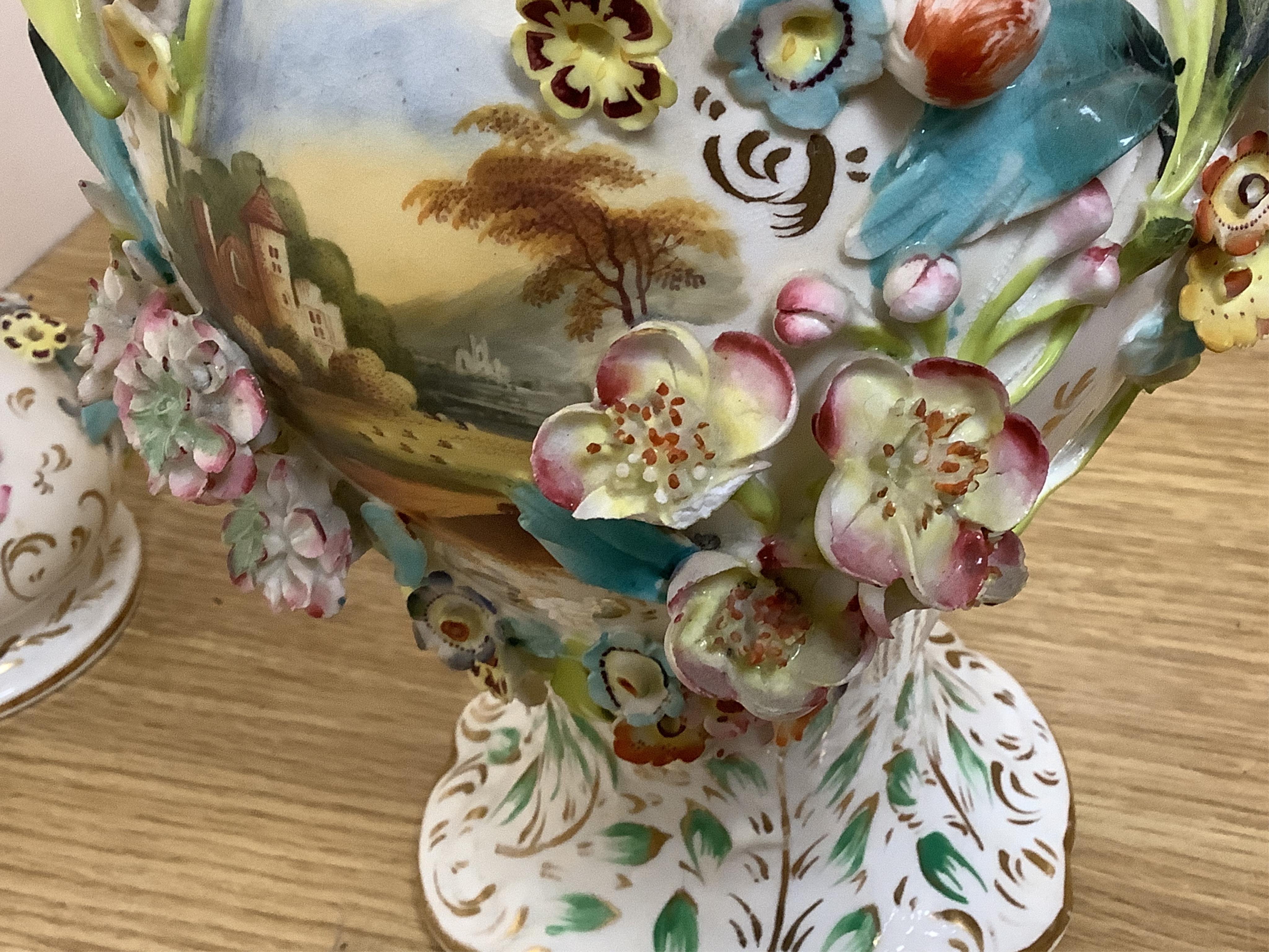 Lot 1234 , A pair of English porcelain floral encrusted vases and covers, c.1830, possibly Samuel Alcock, each painted with landscapes, 44cm high
