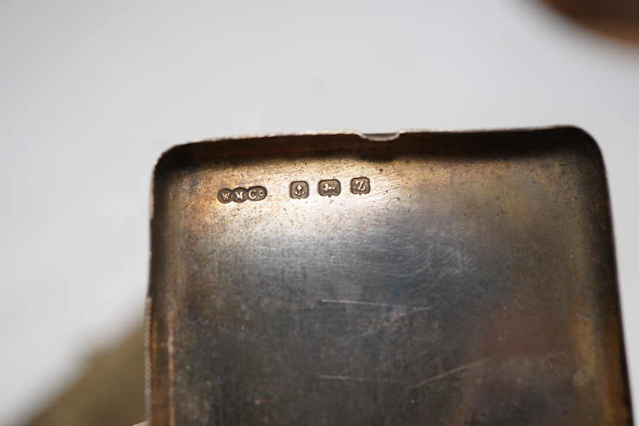 An Edwardian silver mesh evening bag, import marks for Birmingham, 1908, together with a silver heart shaped compact and two silver match sleeves.