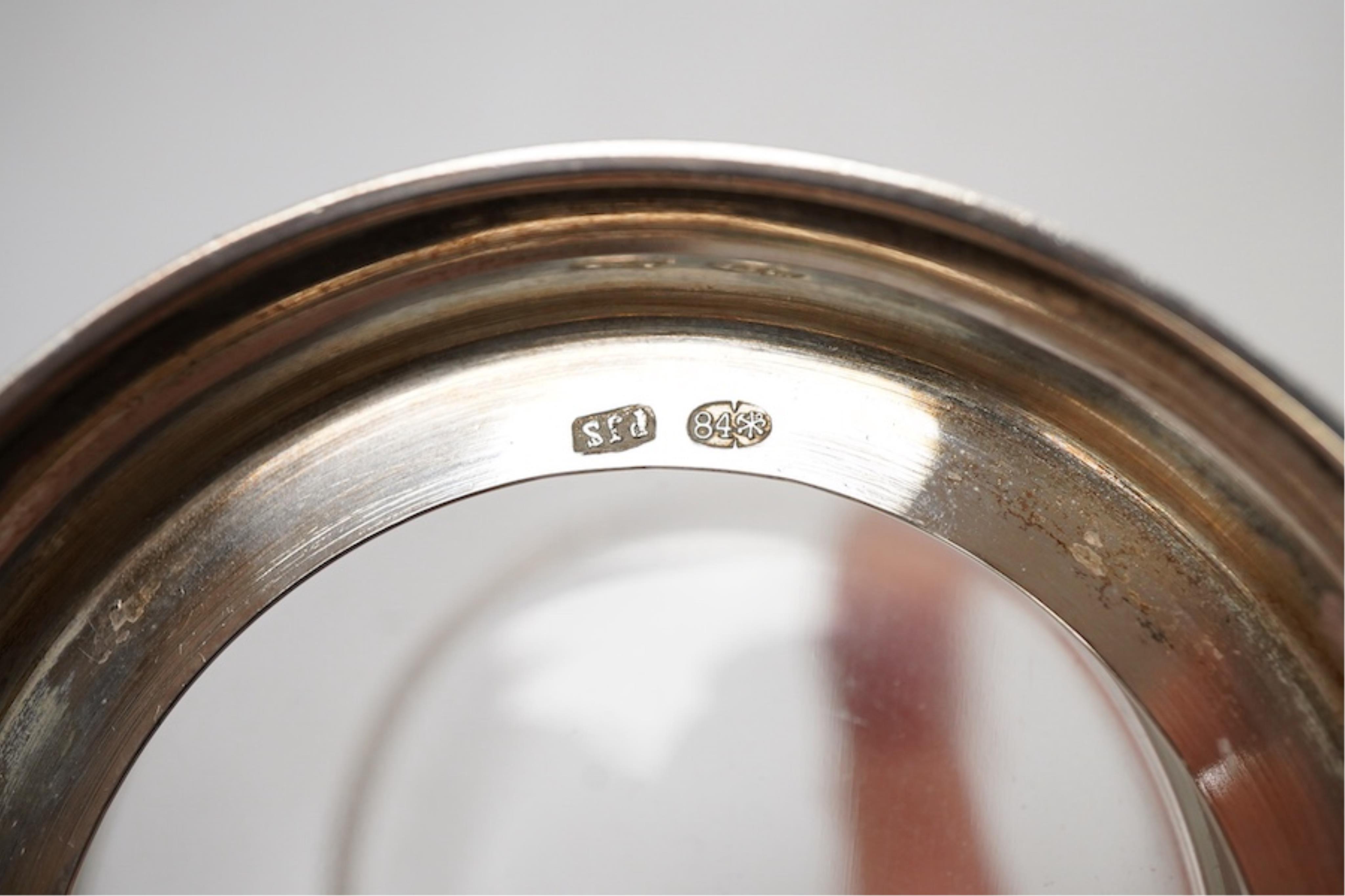 Lot 1846 , Two late 19th/early 20th century Russian 84 zolotnik podstakanniks with Cyrillic engraving and engraved glass beakers, one master PJS, St. Petersburg, together with two Russian 84 zolotnik and niello spoons, with Cyrilli