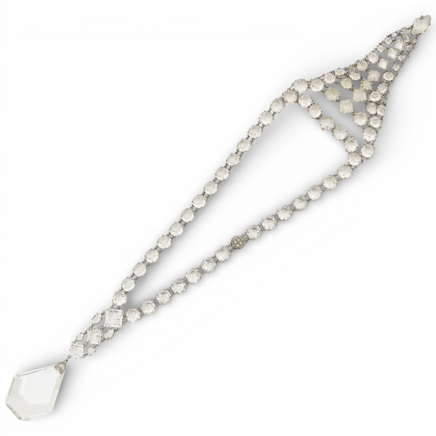 Lot 1088 , An early 20th century ornate white metal and facet cut paste set drop necklace, overall approx. 44cm.
