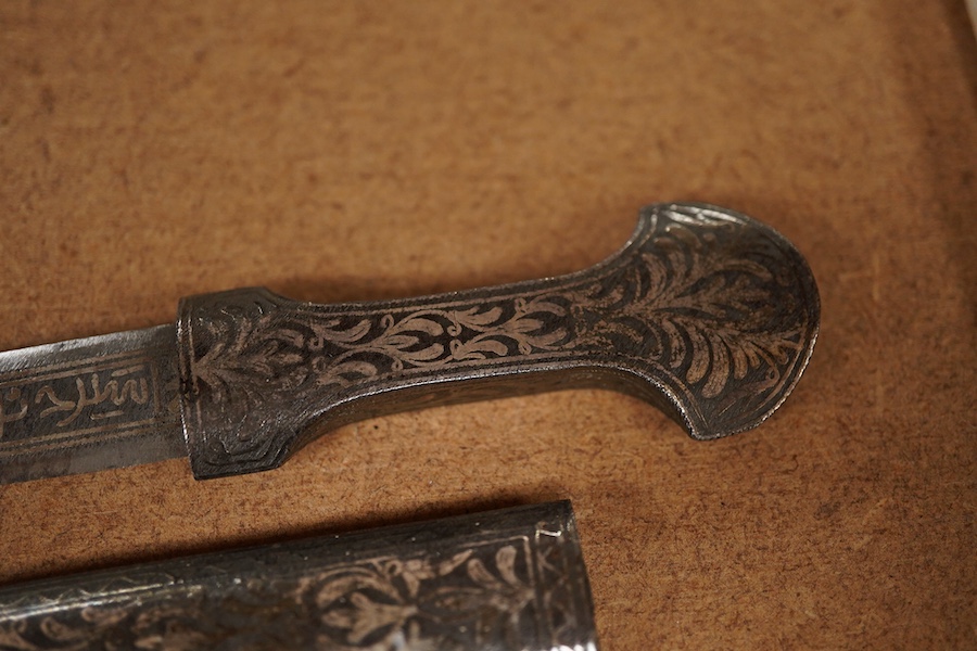 An Ottoman silver damascened dagger c.1900 in matching sheath, blade 9.7cm * Due to new safety regulations and legal restrictions with ParcelForce and Royal Mail, we are unable to pack and/or send swords, bladed items and weaponary through postal service.