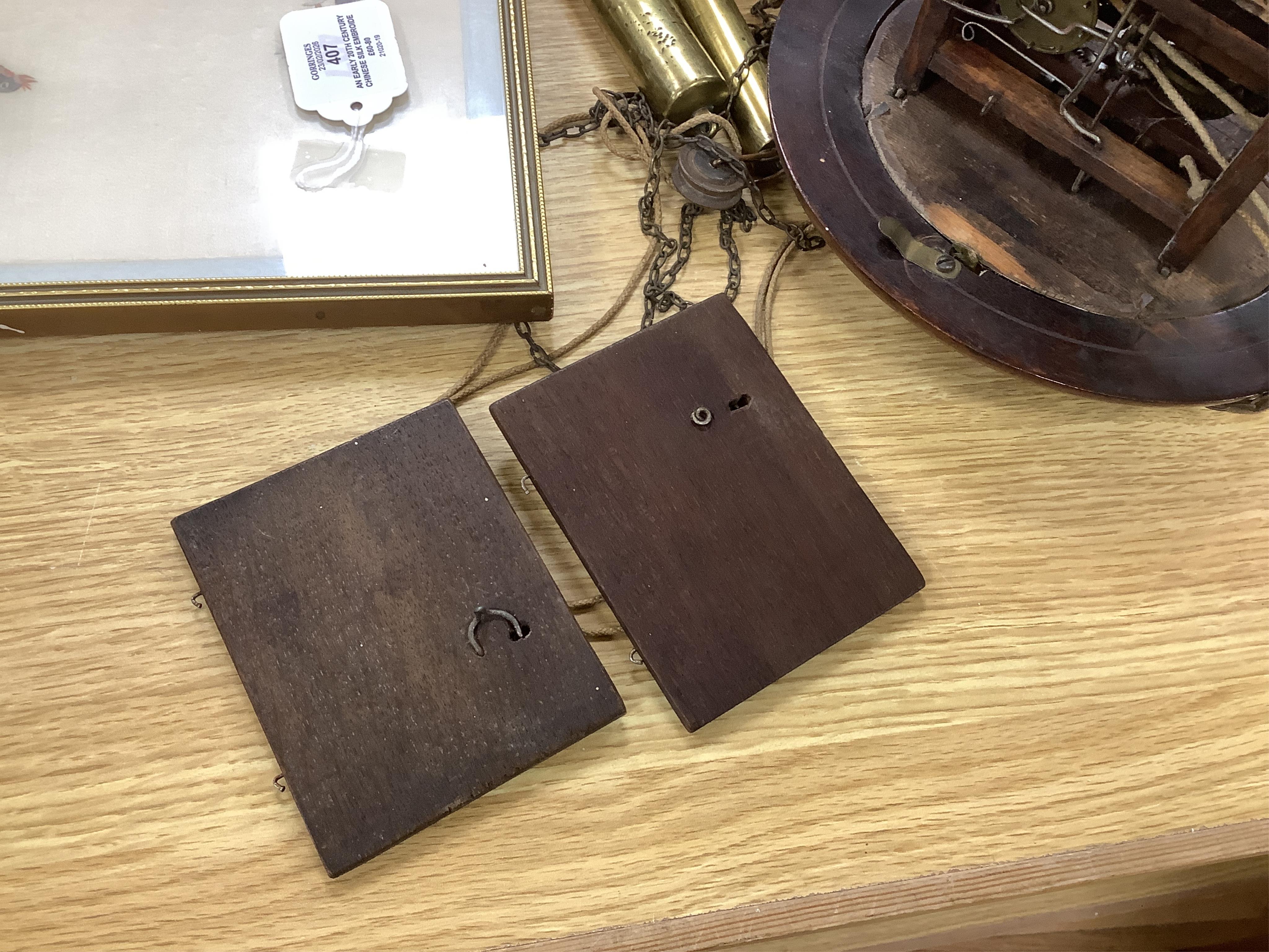 Lot 408 , An Edwardian mahogany, marquetry inlaid mantel clock-26cm x 16cm and a Postman's alarm wall clock