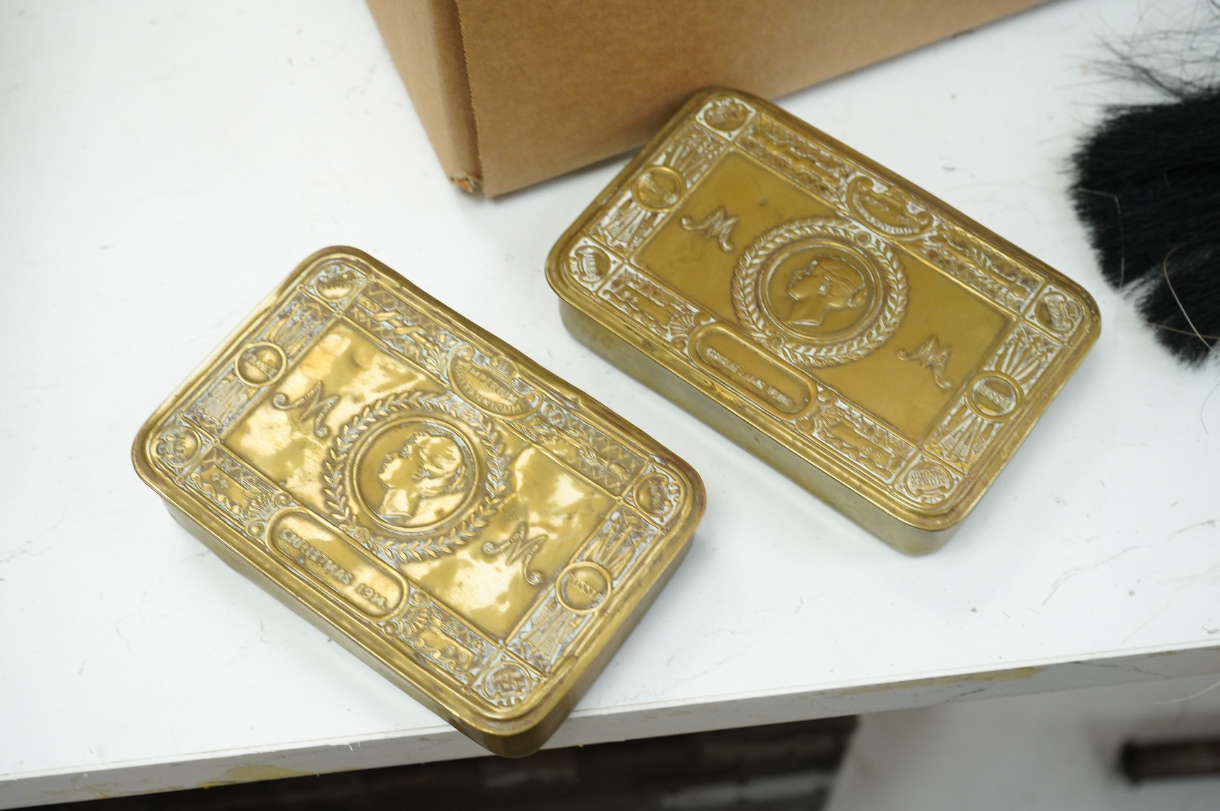 A collection of militaria, etc. including; a Gordon Highlander’s kilt and sporran, three early 20th century Union Flags, a Victorian beaded ‘sweetheart’s’ cushion, two empty First World War Princess Mary Christmas tins, a pair of armour plated epaulettes, five trench art brass helmets, plus a trench art table lighter, etc., a framed Hampshire regiment embroidery, twelve military brass ‘bed plates’ engraved with a number of different regiments including Grenadier Guards, Irish Guards, Sherwood Foresters, the Green Howards, Middlesex Regiment, etc. some with ‘DUTY’ stamped to the reverse, plus a small number of other items