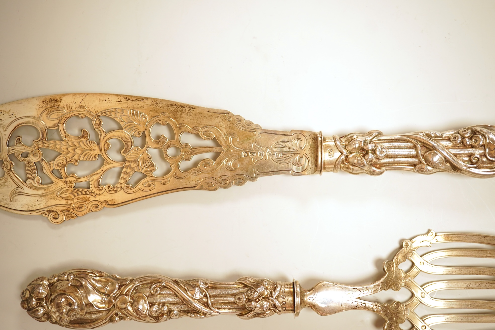 A pair of Victorian ornate silver fish servers, by John Gilbert, Birmingham, 1864, 34.1cm.