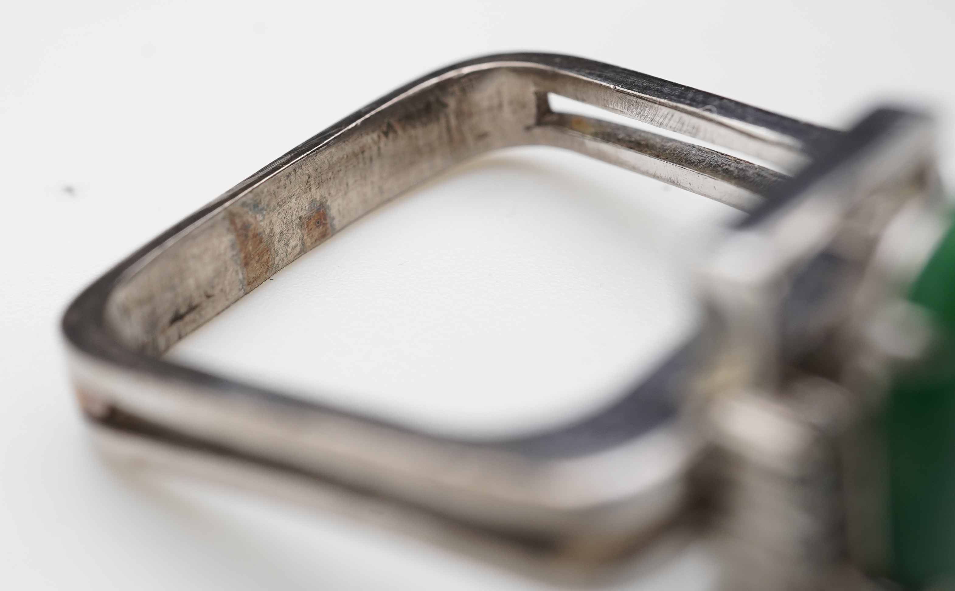 White metal unmarked - partial signature to ring but not possible to read. Likely white gold or platinum. Some surface-reaching fissures to jadeite, one jadeite link cracked.
