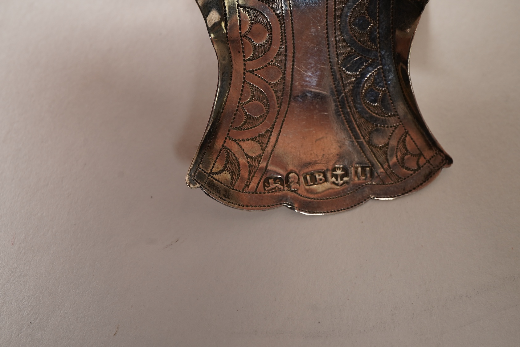 Ten assorted mainly 19th century silver caddy spoons, most with shovel bowls, to include John Bettridge, Birmingham, 1821, Levy & Salaman, Birmingham, 1900, with honeysuckle handle, London, 1981, with thin handle, indistinct marks, with mother of pearl handle, unmarked hourglass pattern (a.f.), George Unite, Birmingham, 1834 (a.f.), John Bettridge, Birmingham, 1818 (a.f.), Joseph Taylor, Birmingham, 1811, Cocks & Bettridge, Birmingham, 1805, with fern engraved bowl, no maker's mark, Birmingham, 1807, with leaf engraved bowl, 89mm et infra.