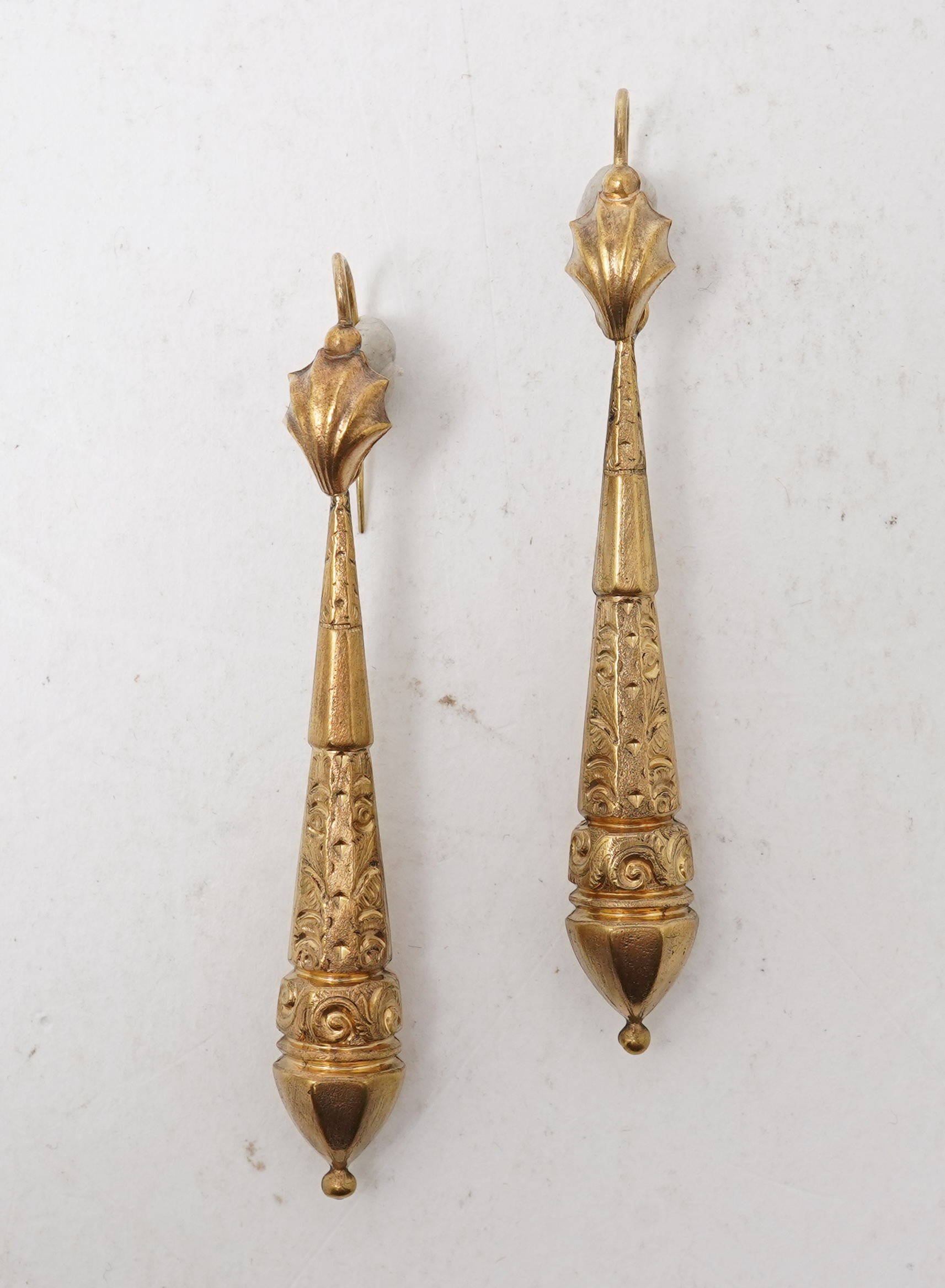 A collection of pinchbeck/gilt metal jewels, 19th century, comprising: a panel bracelet of embossed foliate design, length 17.5cm; a fancy mesh link bracelet, to a foliate clasp set with pink pastes, length 19.5cm; and two pairs of pendant earrings, longest pair 7cm, hook fittings