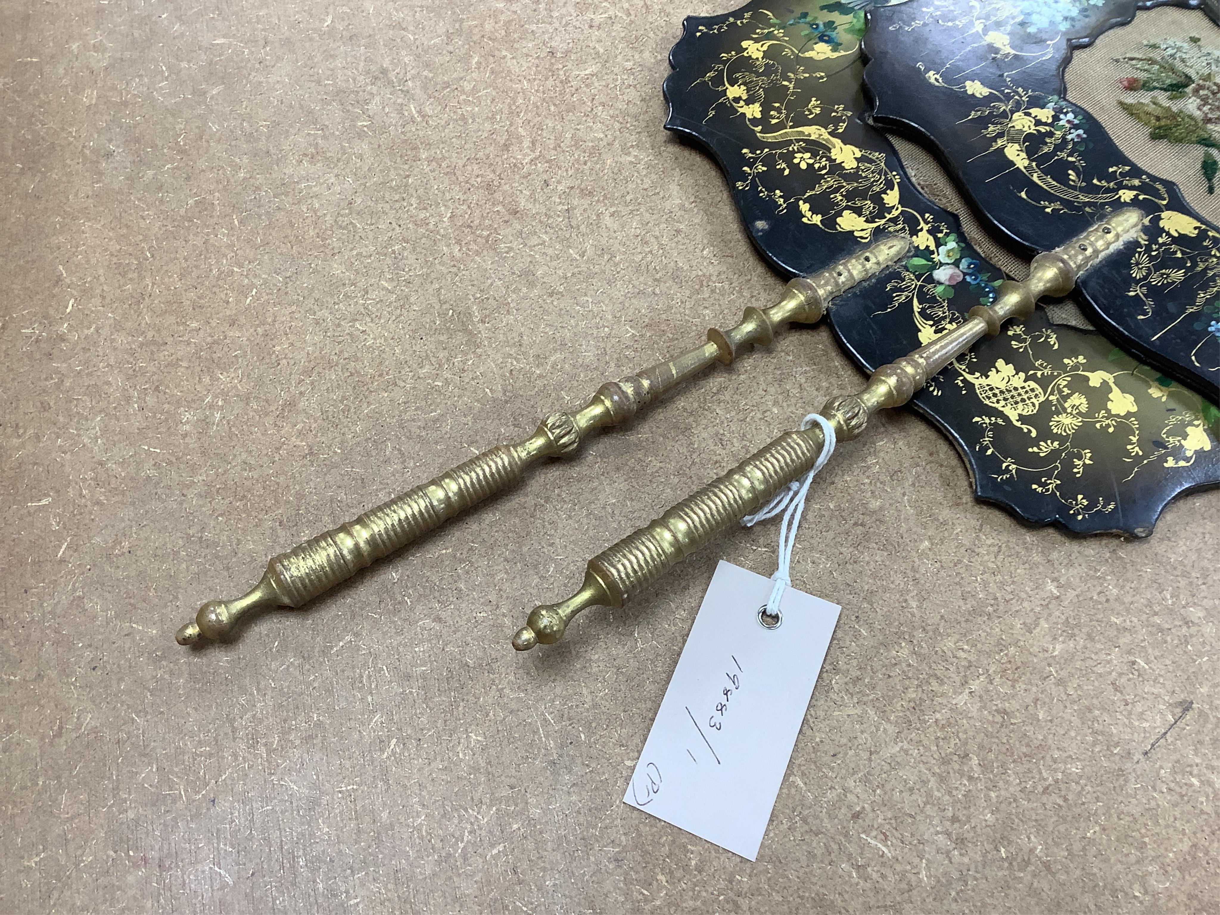 A pair of early Victorian papier maché hand screens, each with embroidered with cross stitched flowers, 41cm in length