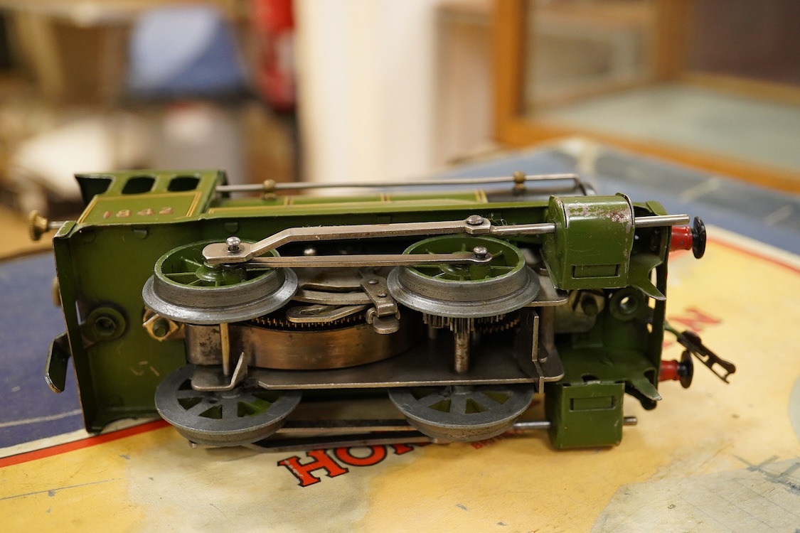 Lot 287 , Two Hornby 0 gauge tinplate clockwork train sets; a No.601 LMS Goods Set with 0-4-0 tender locomotive, 5600, in maroon livery, etc., together with a No.501 LNER passenger set with 0-4-0 tender locomotive, 1842, in green