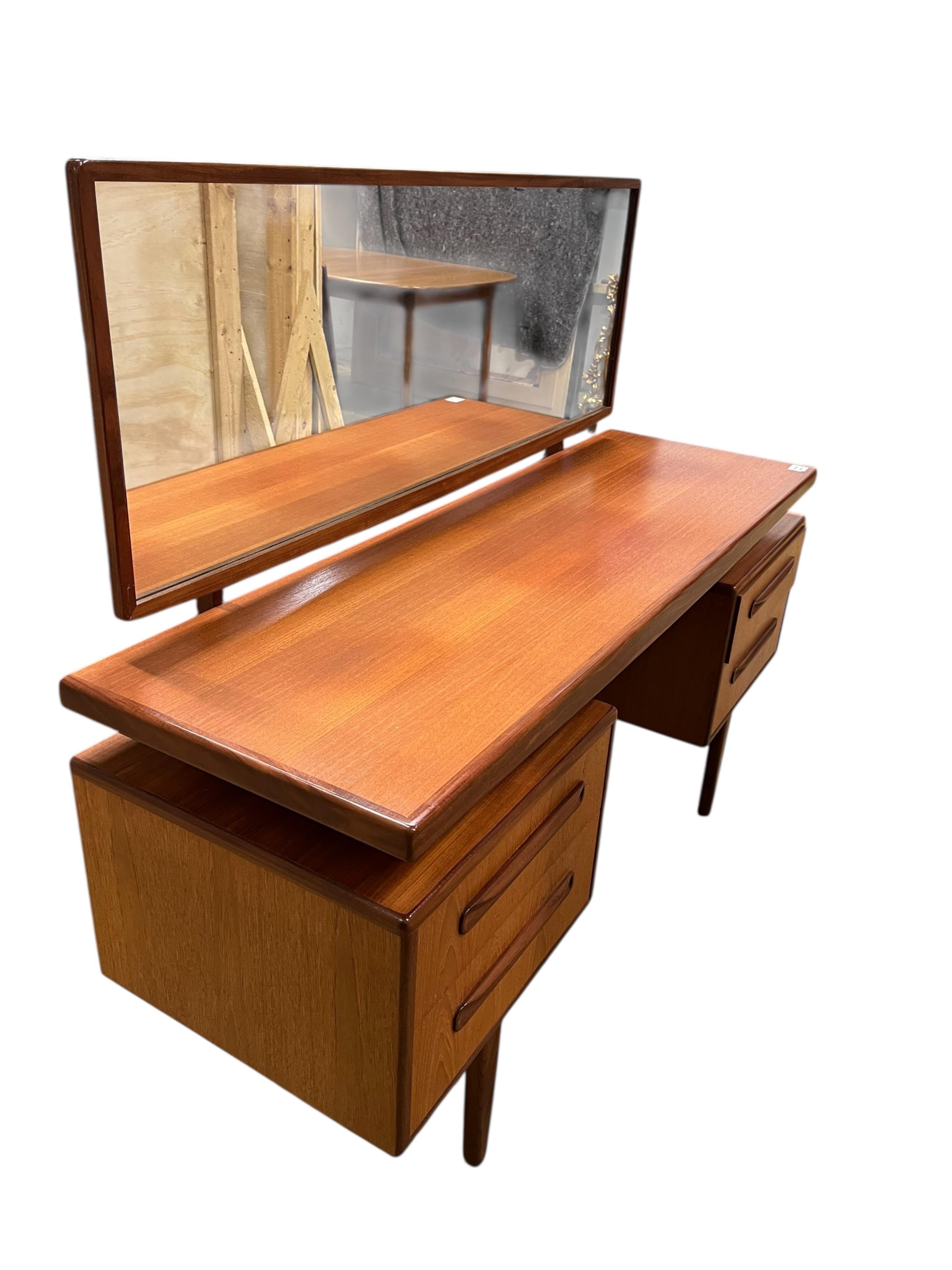 A mid century G Plan Fresco teak bedroom suite comprising a three door wardrobe, a two door wardrobe, two six drawer chests, dressing table, headboard and a pair of bedside chests